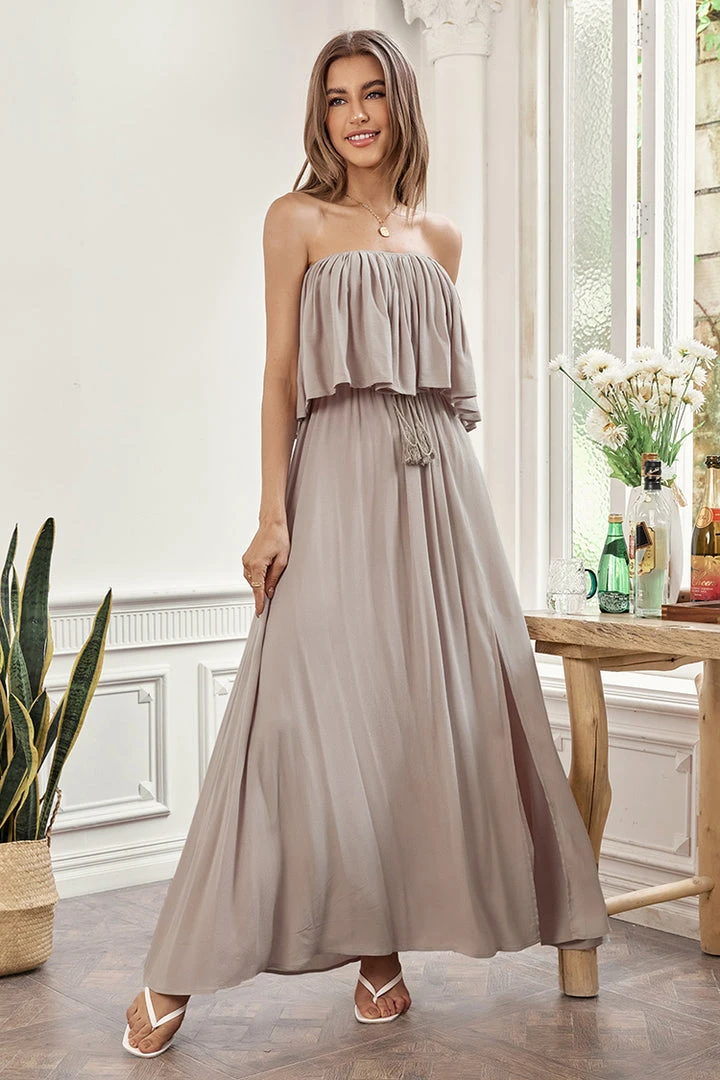 Our Gerry Sleeveless Pleated Maxi Dress features smocking and tie waist design which is great for a cocktail.