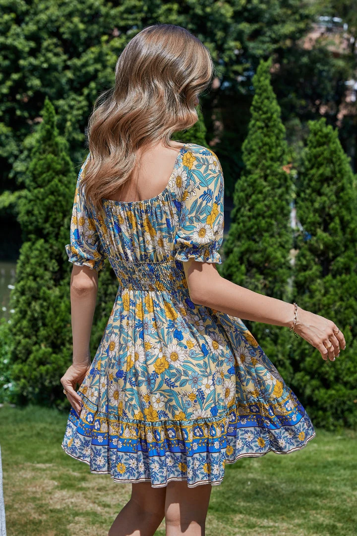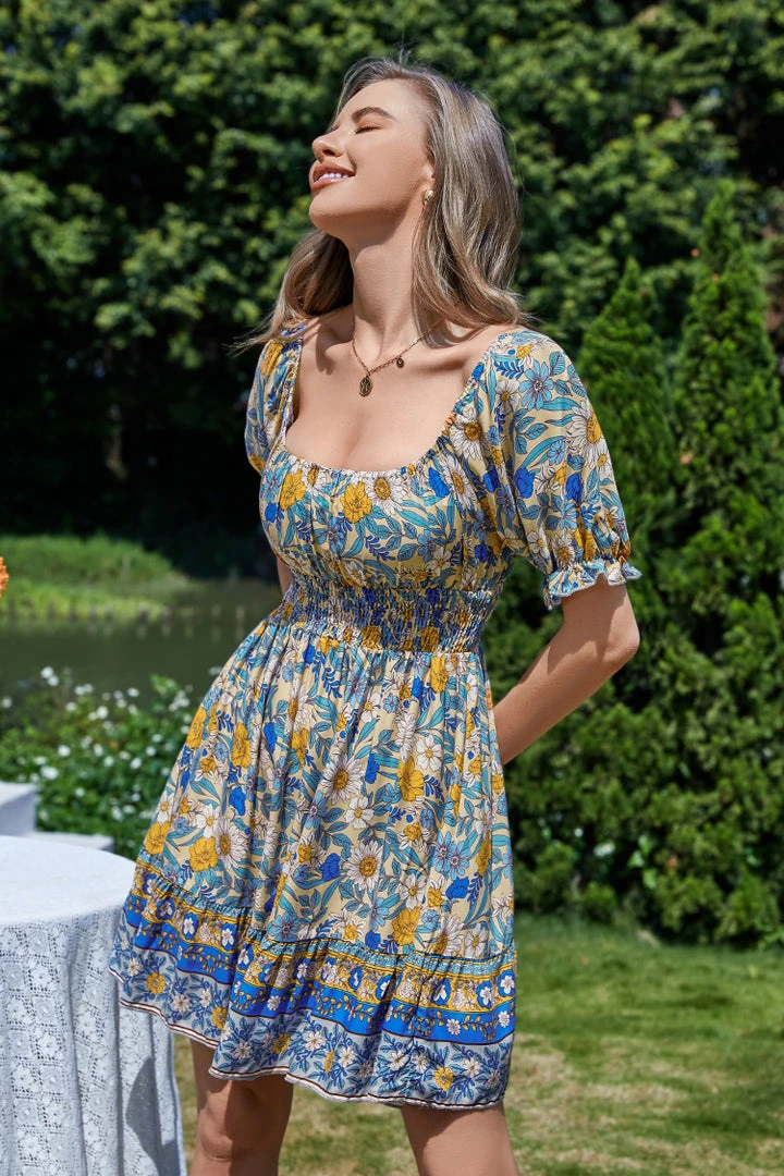 This Gussie Square Neck Puff Sleeve Sheath Dress uses flower patterns and bright colors to give people a feeling of summer. Wearing it, you will be as charming as summer.