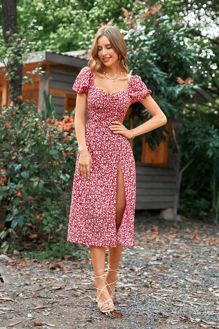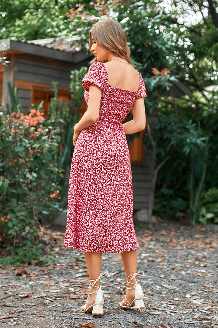 This Honopu Square Neck A-Shape Dress features ruching back and red ditsy print, full of sweet and lovely vibes, perfect to wear to the beach and enjoy the blending of waves and wind.