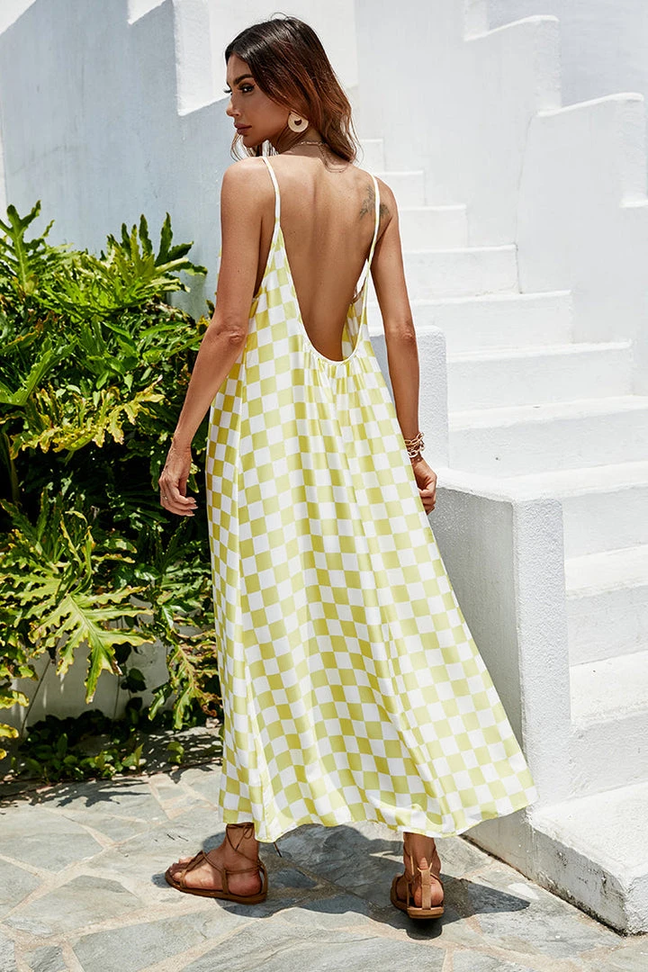 Step out in style with Jazmyne Yellow Checkered Backless Slip Dress. Featured with checkered print and blackless detail in a timeless A-shape silhouette. It’s perfect for your next event.