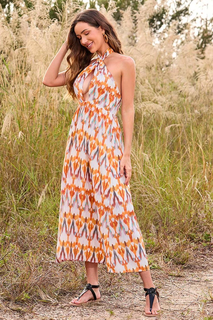Get ready for your next vacay with Kayleigh Geometric Print Cross Halter Dress. This dress features geometric print and cross halter design. Self ties at the neck for the perfect fit.