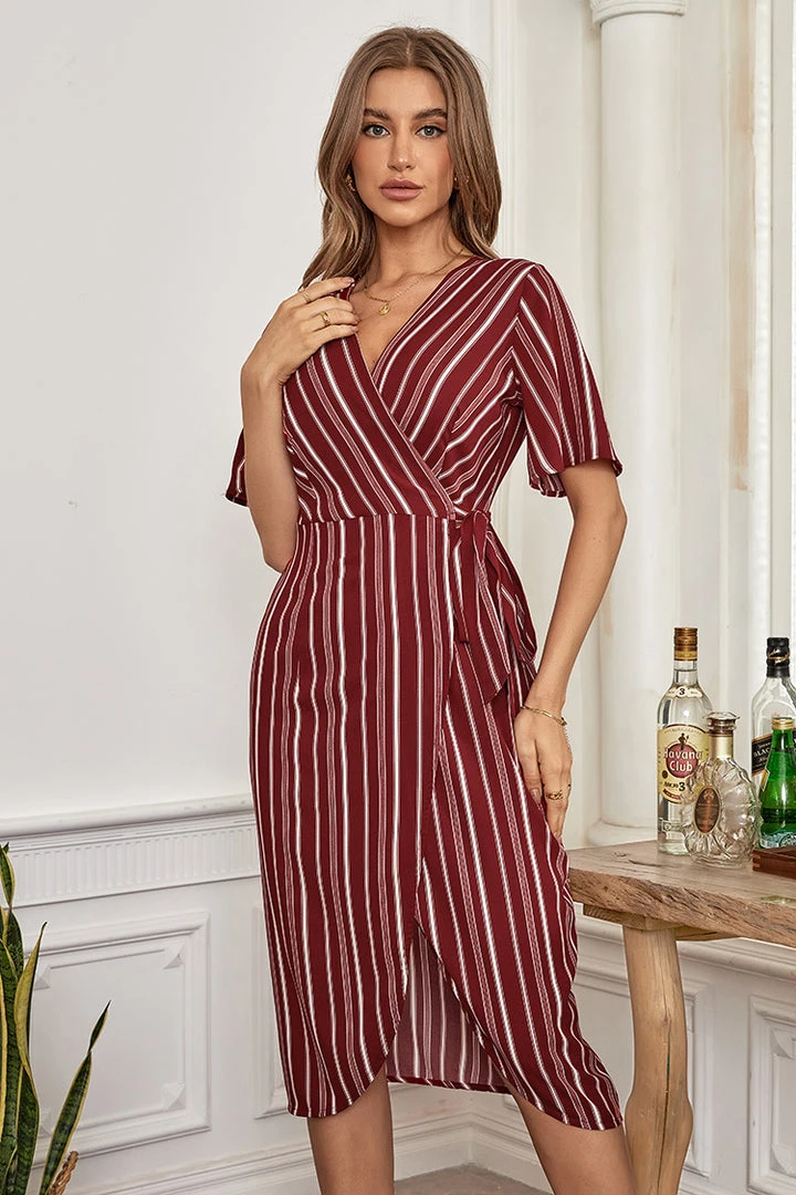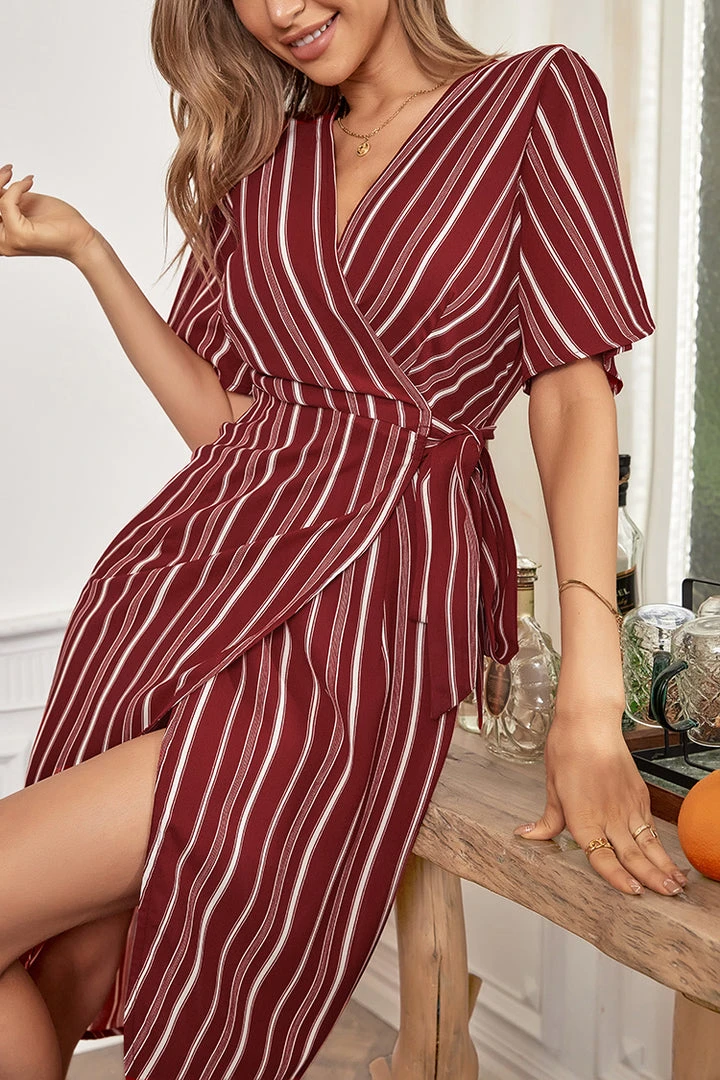 This Leanna V-neck Half Sleeves Lace Up A-Shape Dress features half sleeve and tie waist. This dress is friendly to all body types and can be worn without restraint.