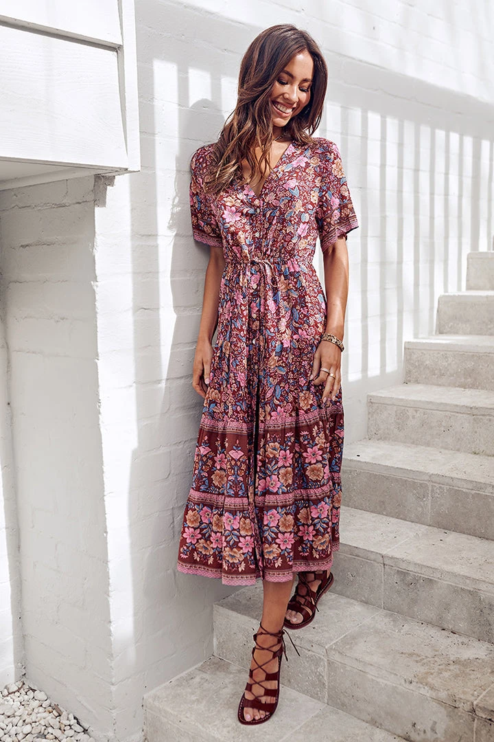 Feel playful and pretty in this V-neck Tea Length Boho Pattern A-Shape Dress! Features a V neckline and short sleeves. Pair with sandals or white cloth sneakers for relaxed summertime chic.