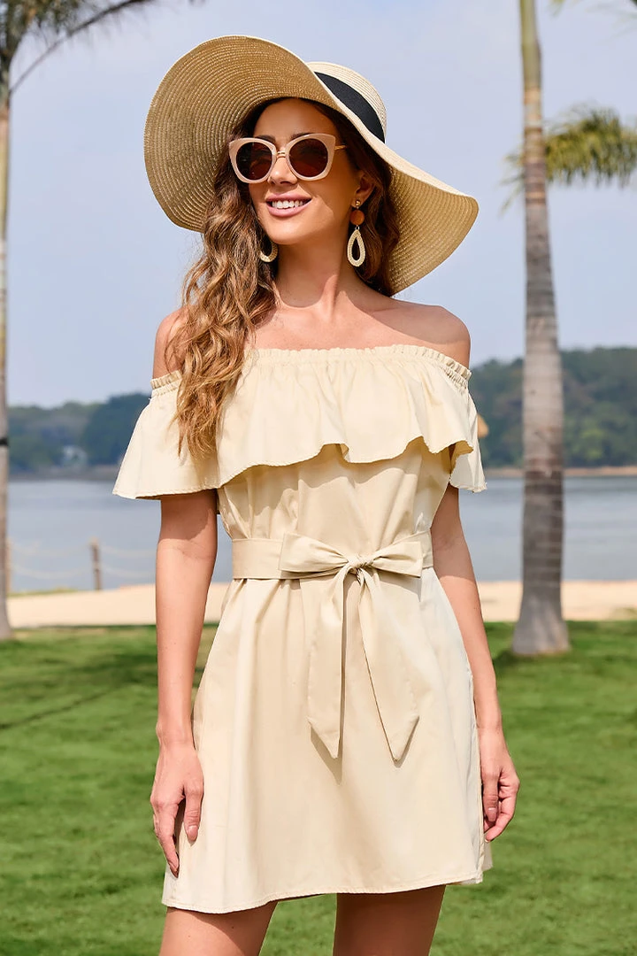 Stay cool in Marlene Ruffle Off Shoulder Tie Waist Dress. This A-line sundress features off shoulder with ruffle hem and self tie belt – perfect for long summer days and hot summer nights.
