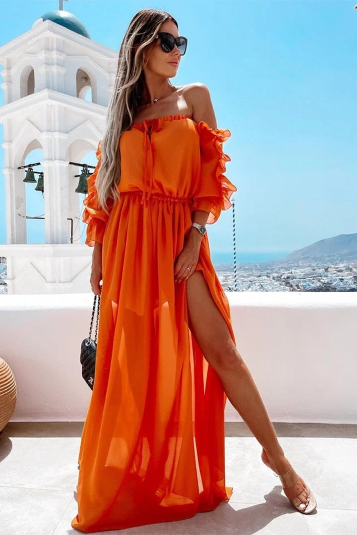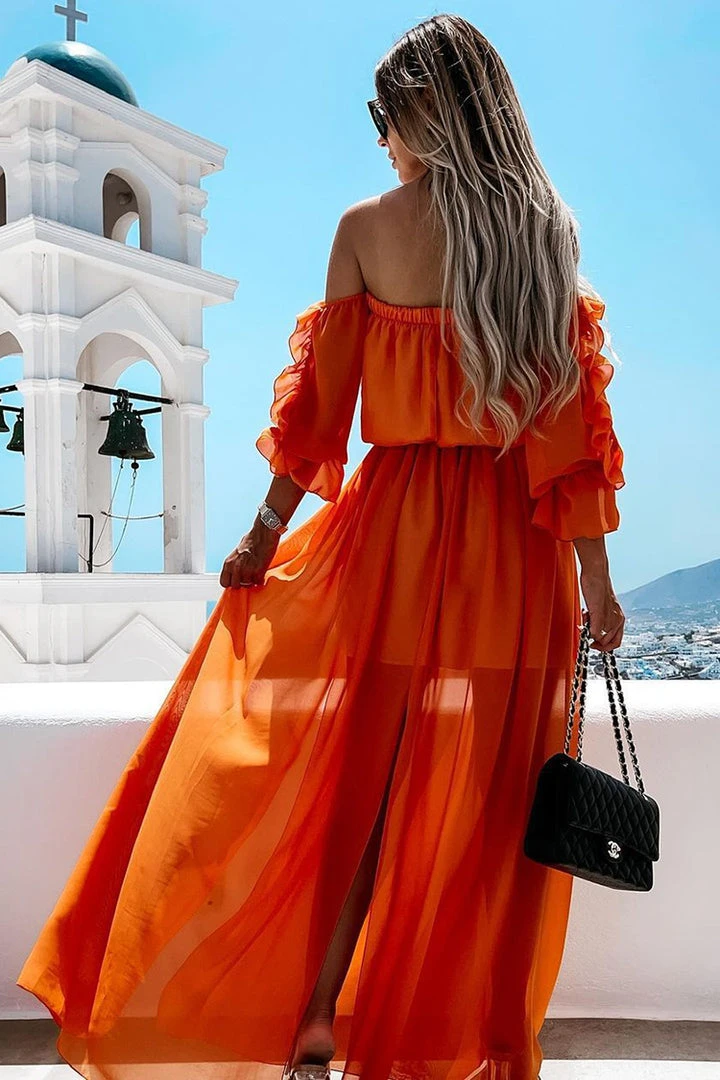 The dress of this Half Sleeves Elastic Waist Ruffle A-Shape Dress is very unique, very girlish, and its color matching is also very fresh and vibrant. It features off-shoulder sleeve and elastic waist. You can attract people’s attention by wearing it.