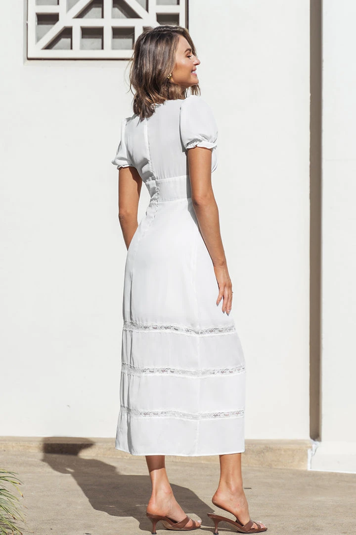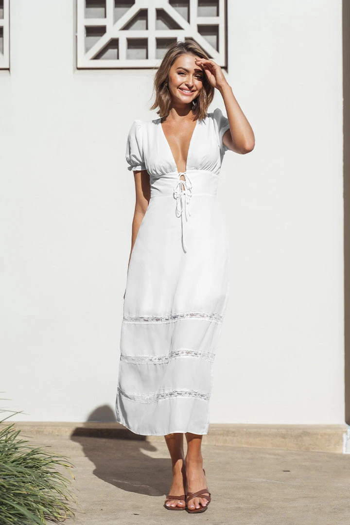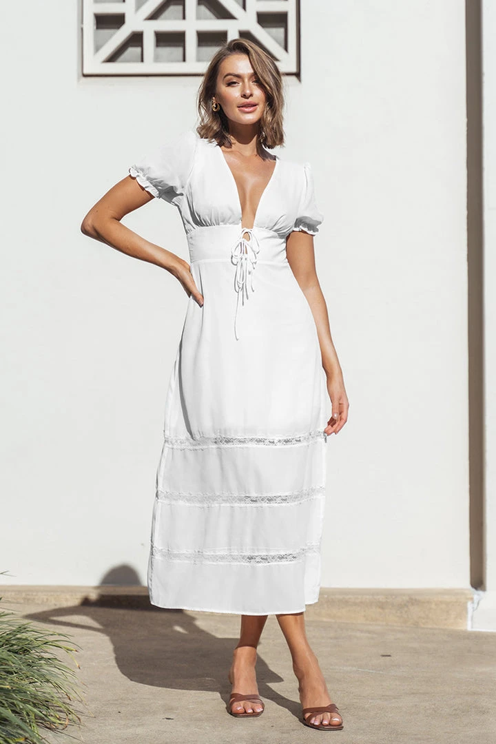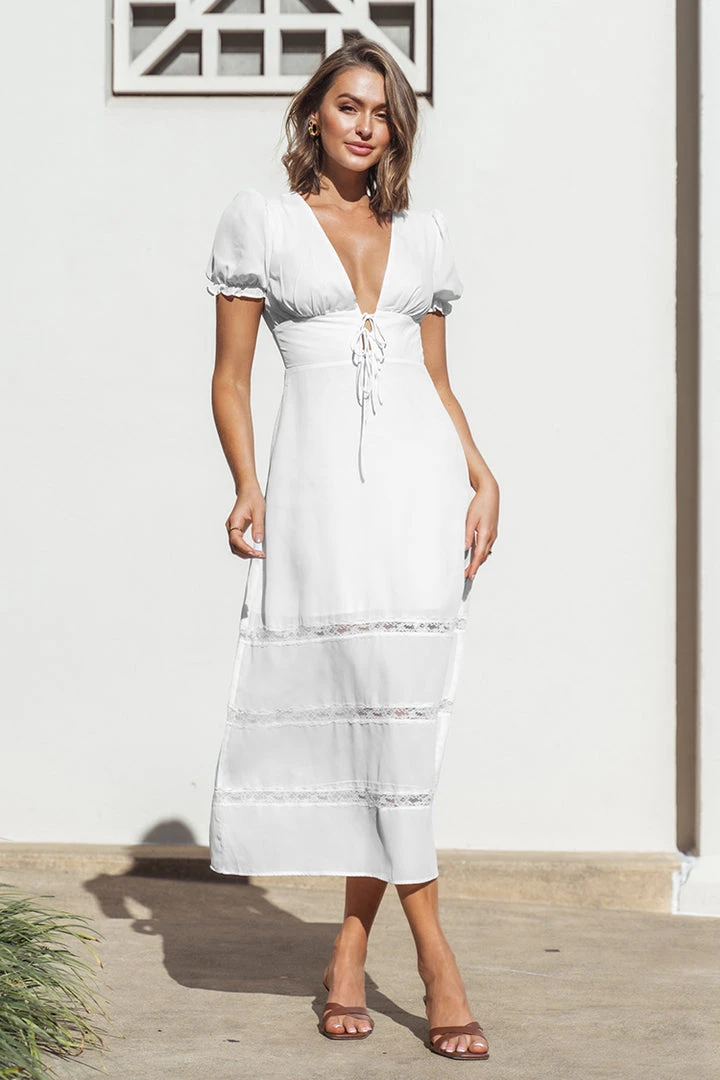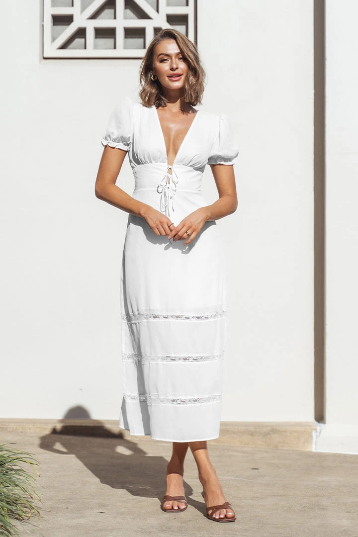 Our Myla Plunge Tie Waist A-Shape Dress featurs bubble sleeves and lace trims design, suitable for daily wear, vacation and beach scenes.