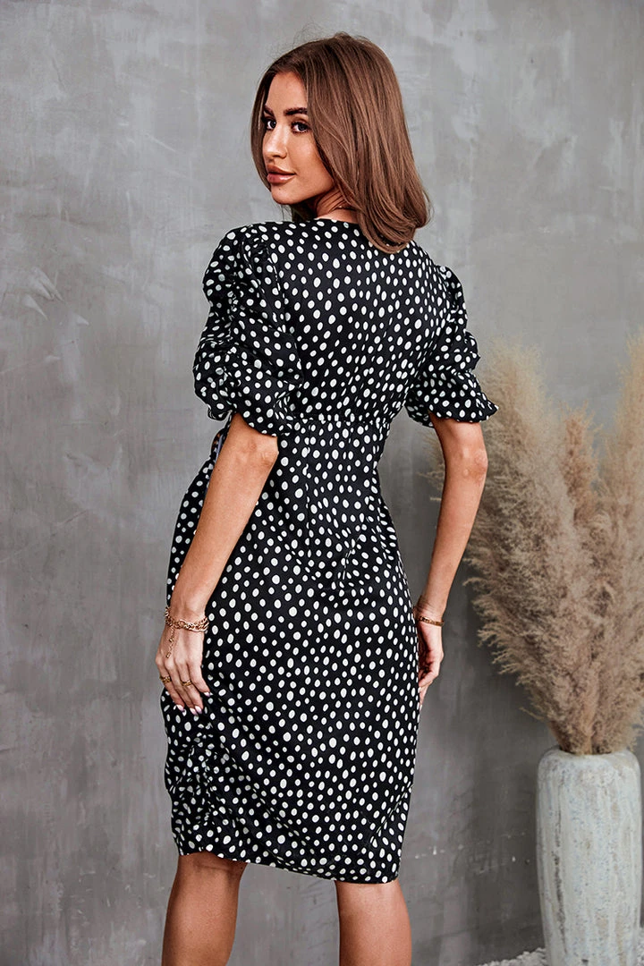 Create an unforgettable look with the V-neck Short Sleeve Fitted Waisted Dress. This dress is complete with a polka dot print, short sleeve and o-ring detail.