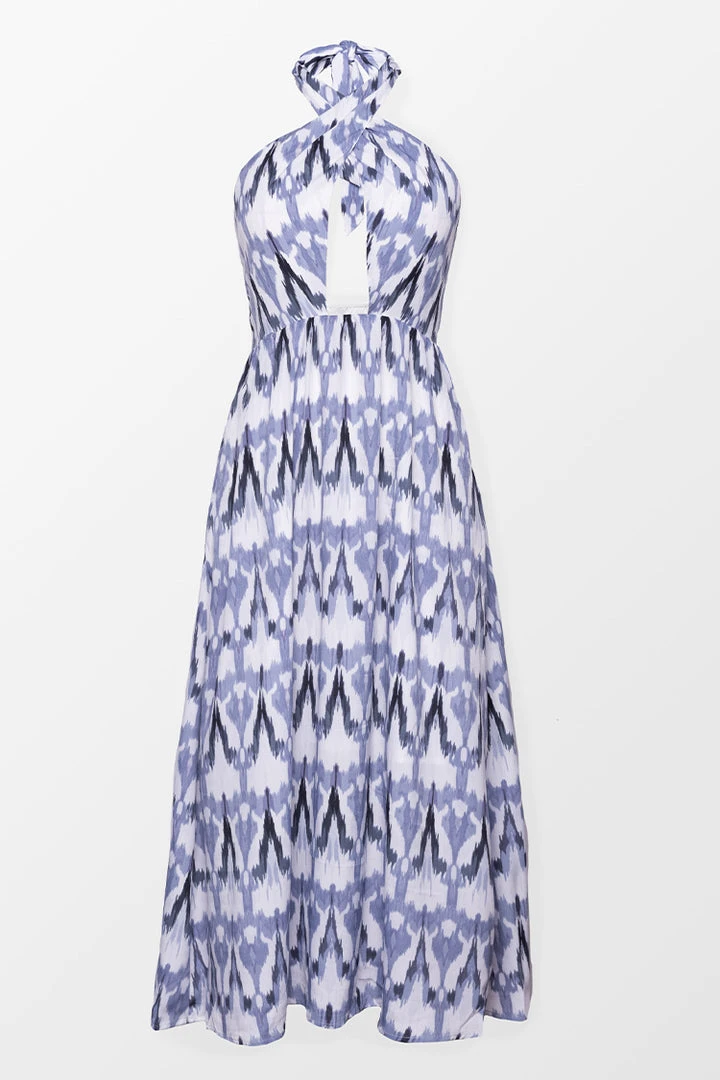 Get ready for your next vacay with Sutton Cross Halter Tie Neck Dress. This dress features geometric print and cross halter design. Self ties at the neck for the perfect fit.