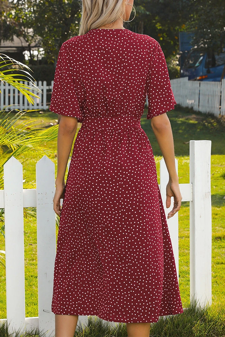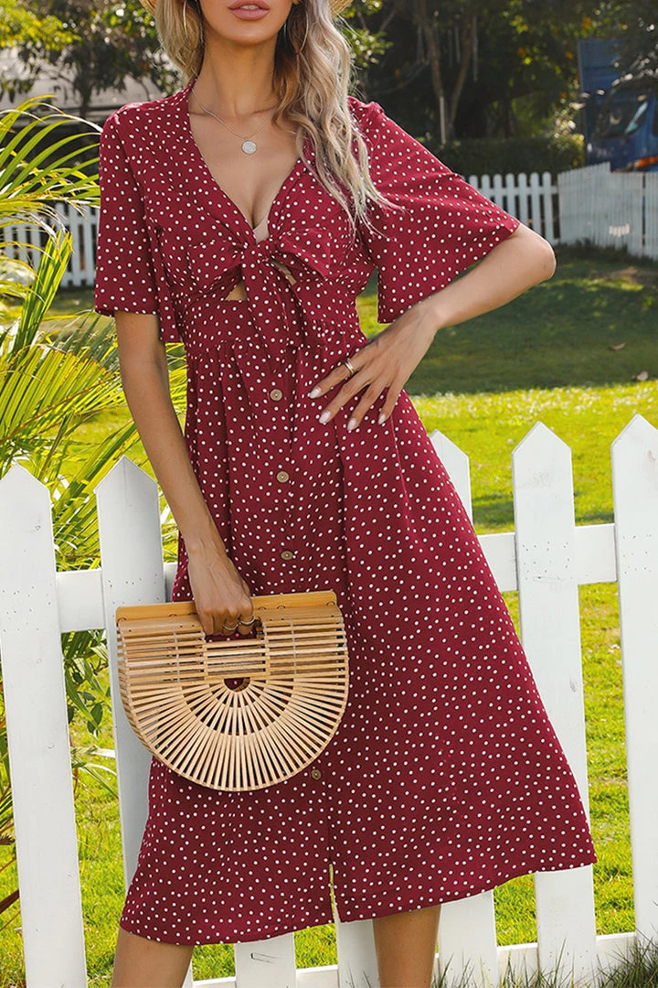 Add this season’s must-have shade to your look with this V-neck Bow Tie Dots A-shape Dress. Featuring dots print, a V neckline, and a bow tie on the chest.