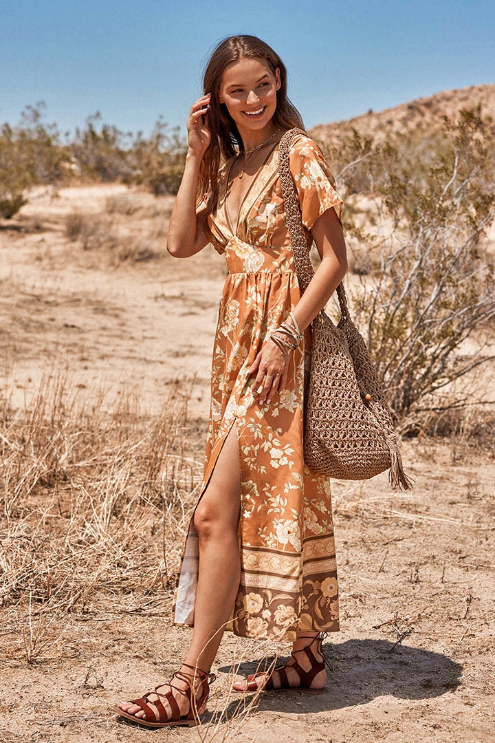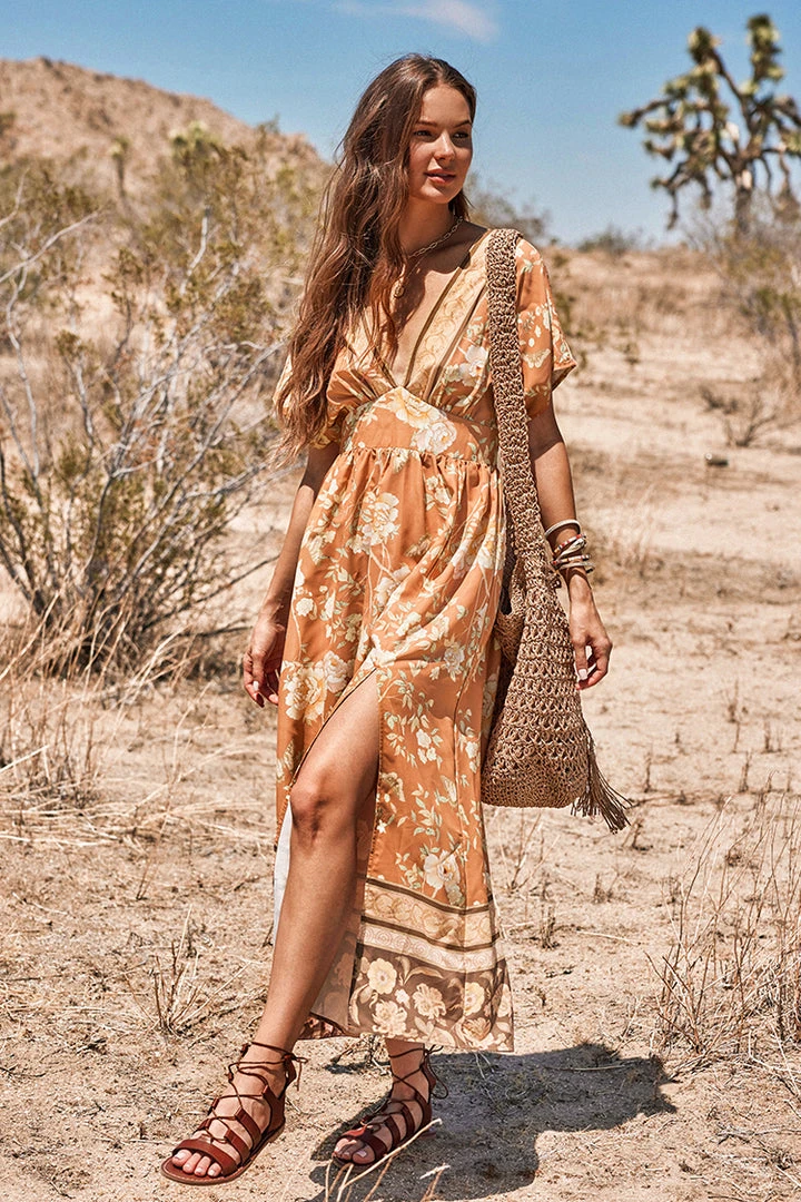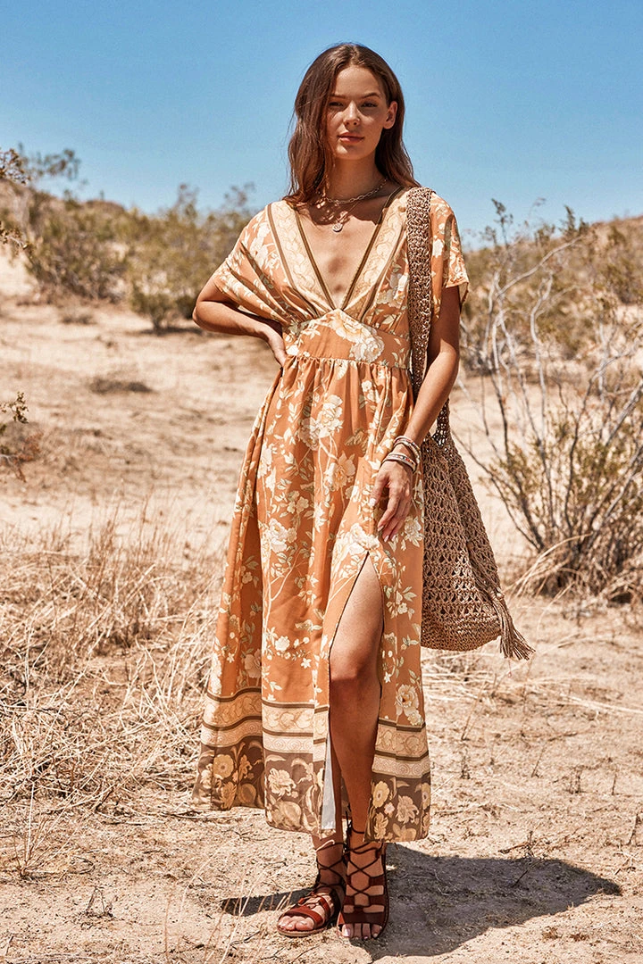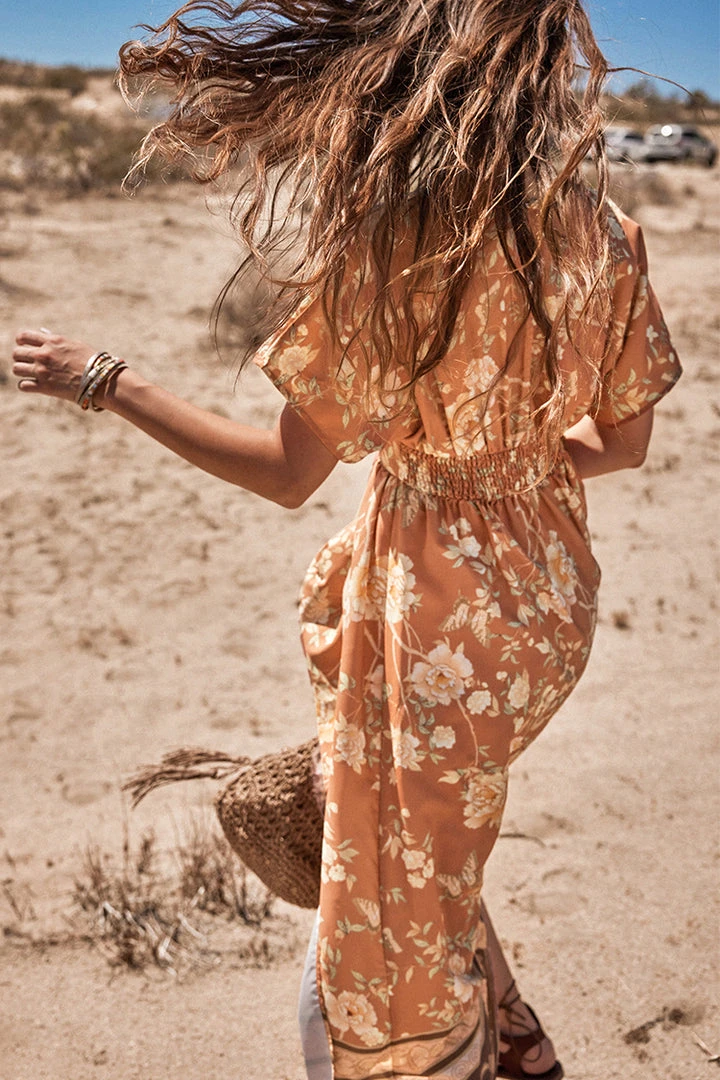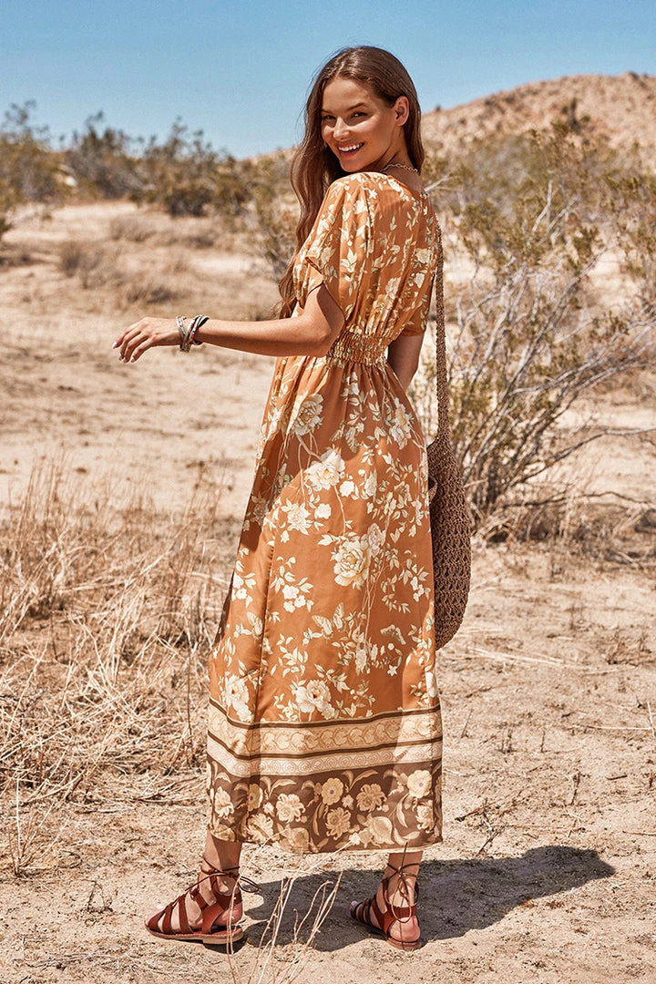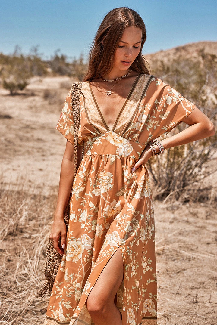 Look pretty in this Ruching Flared Sleeve Plunge Dress. It features a plunge neckline, a vivid floral print, flared sleeves and ruching detailling.