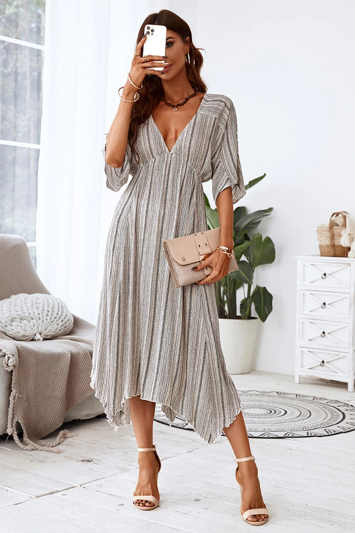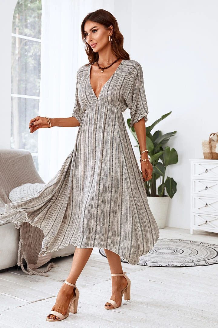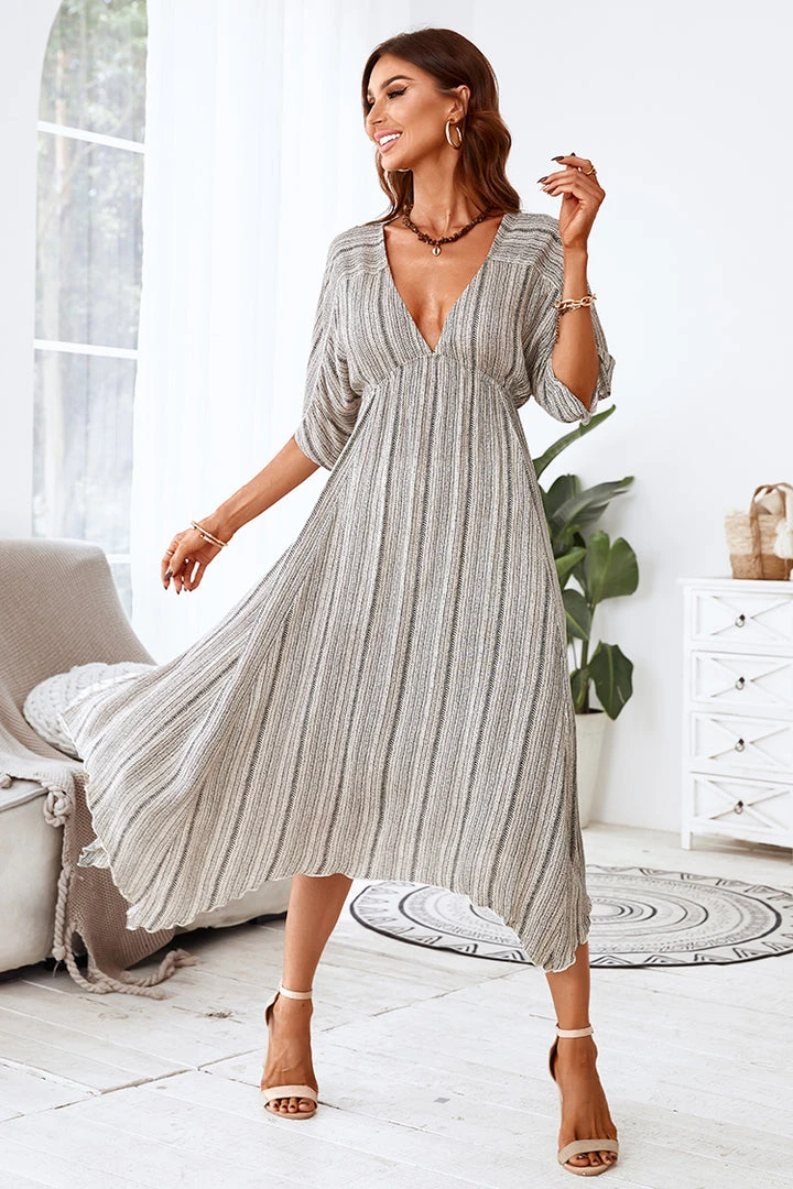This V-neck Stripes Half Sleeves A-shape Dress is the piece you need for your summer wardrobe! Featuring a V-neckline and dolman sleeves. Style it with flat sandals for those romantic walks by the beach.
