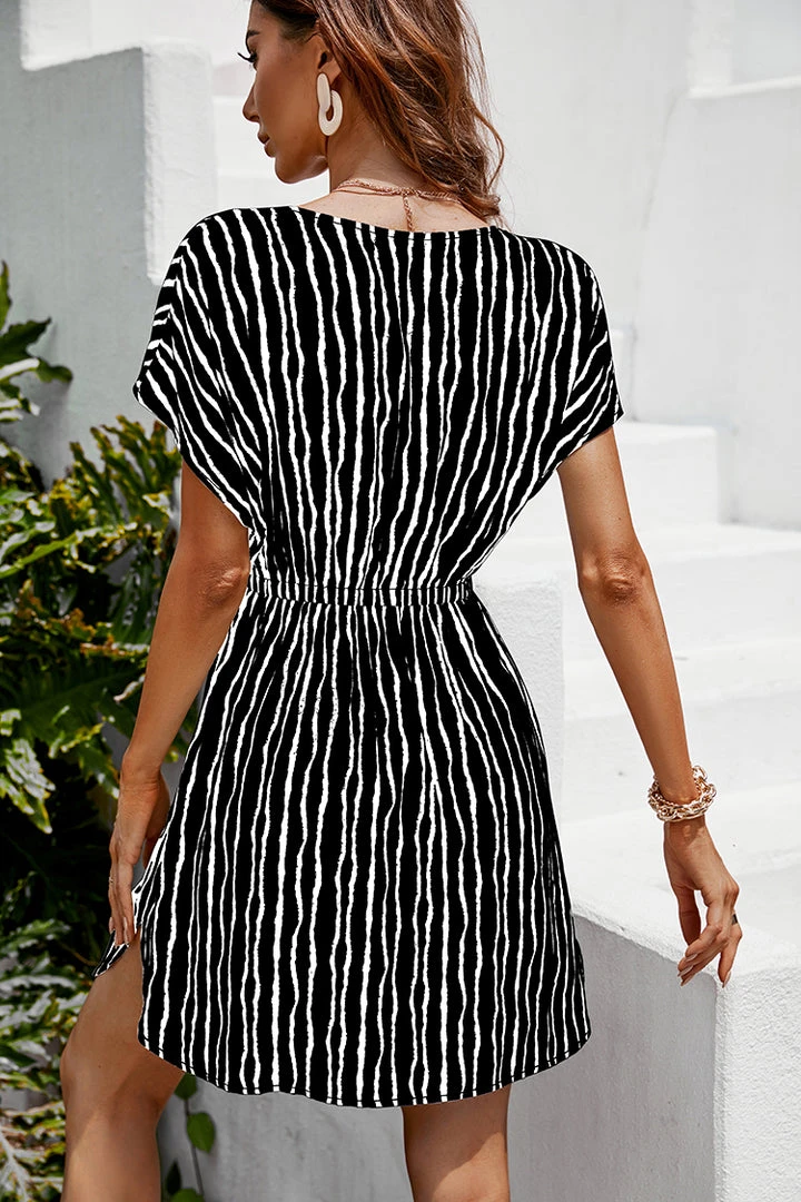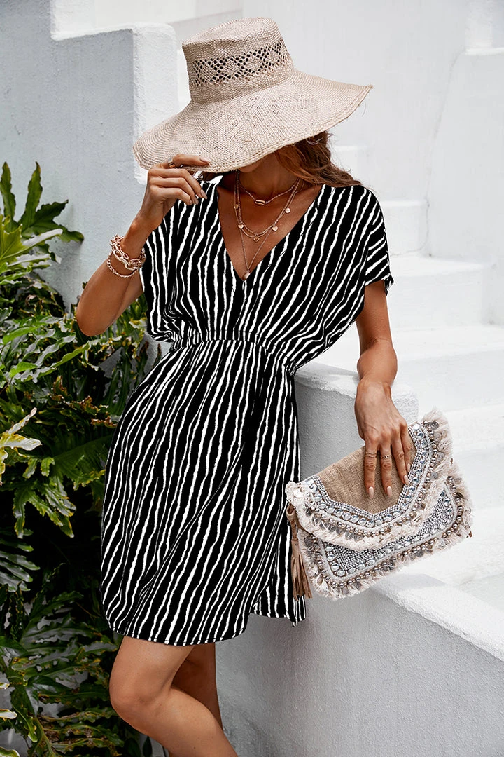 We are loving this V-neck Stripes Short Cover-up Dress for your new season wardrobe. Featuring smocking design and a plunge neckline. Style with a shoulder bag for a glam finish.