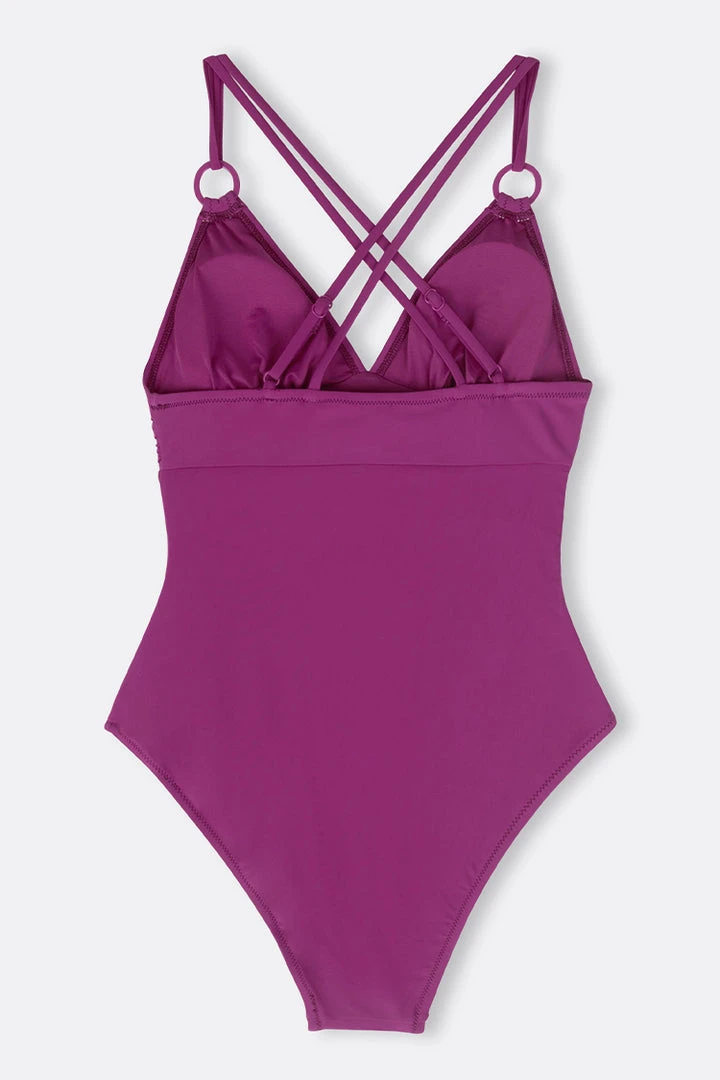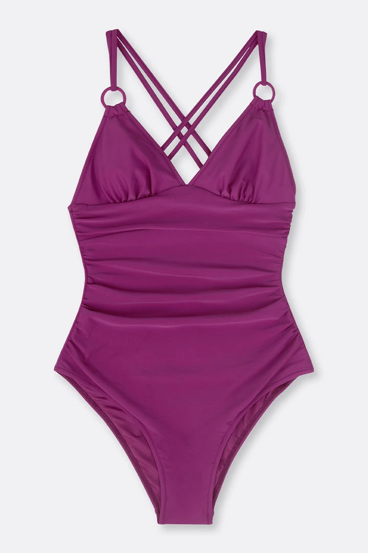 Our Elliot O-ring Crisscross Back One Piece Swimsuit is a fun play on the beach. Features double crisscross back straps with o-ring and ruched front detailing.