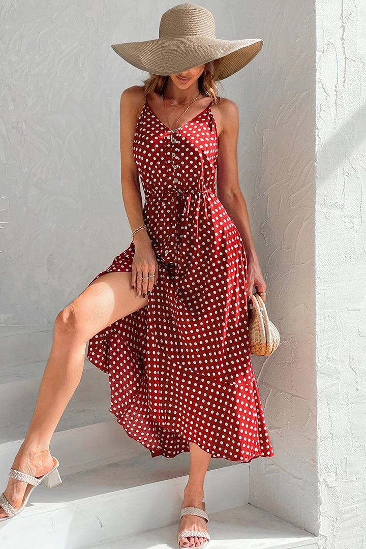 Add a touch of sweetness to your new season wardrobe with this dress. Featuring dots print with a v-neck detail. Pair with slip-on heels and simple accessories for a look.