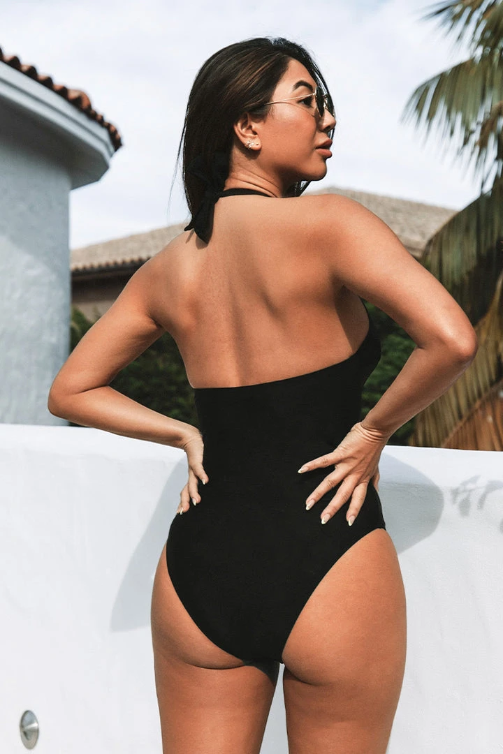 We love this classic black one-piece swimsuit for the mid-summer season, it features a plunging halter neckline, front keyhole, and classic bum coverage.