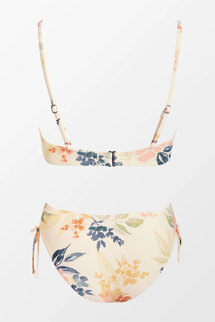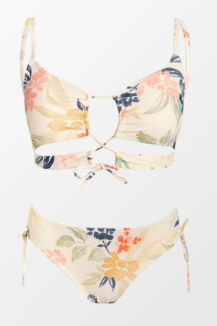 The vibrant floral print and the fun detailing complete this chic bikini set. The center keyholes and the tie front add a flirty touch to the style. Pair with the matching bikini bottom with adjustable drawstring ties at the sides.