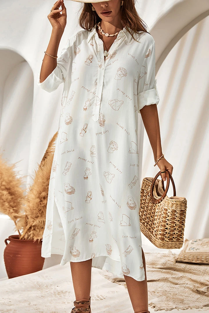 This Gabriela Long Sleeve Loose Waisted Button Shirt Dress with a center front placket with buttons and a simple print is suitable for everyday casual and other scenarios.