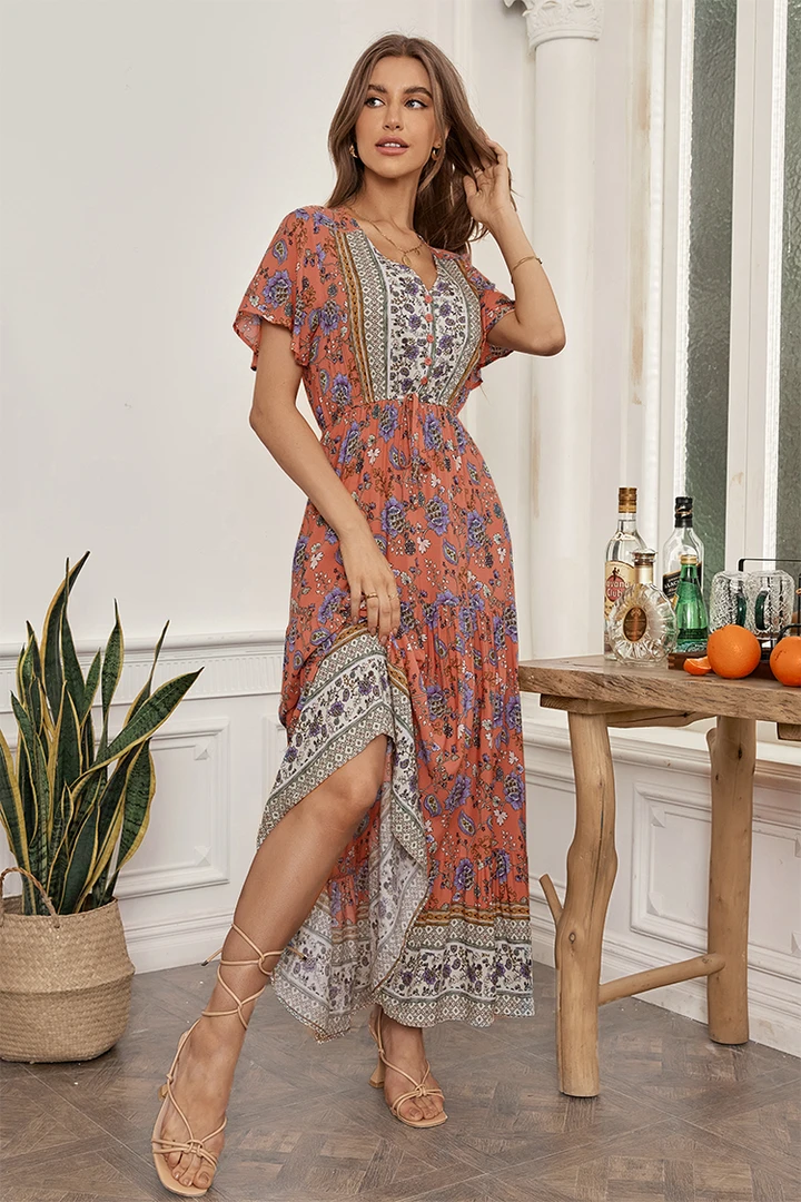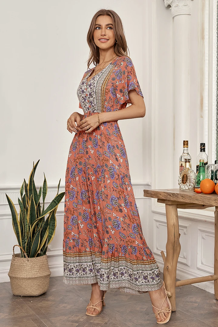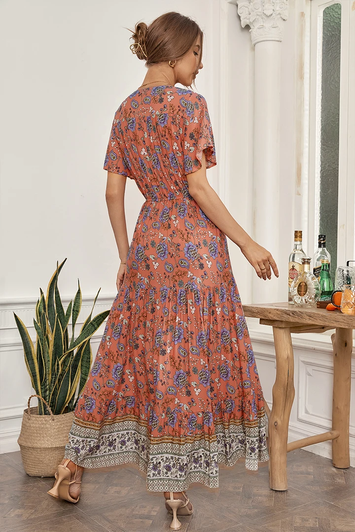 Timeless and classy, this Galilea V-neck Boho Tie A-Shape Dress will never go out of style. This dress detailed with elastic waist and boho print.