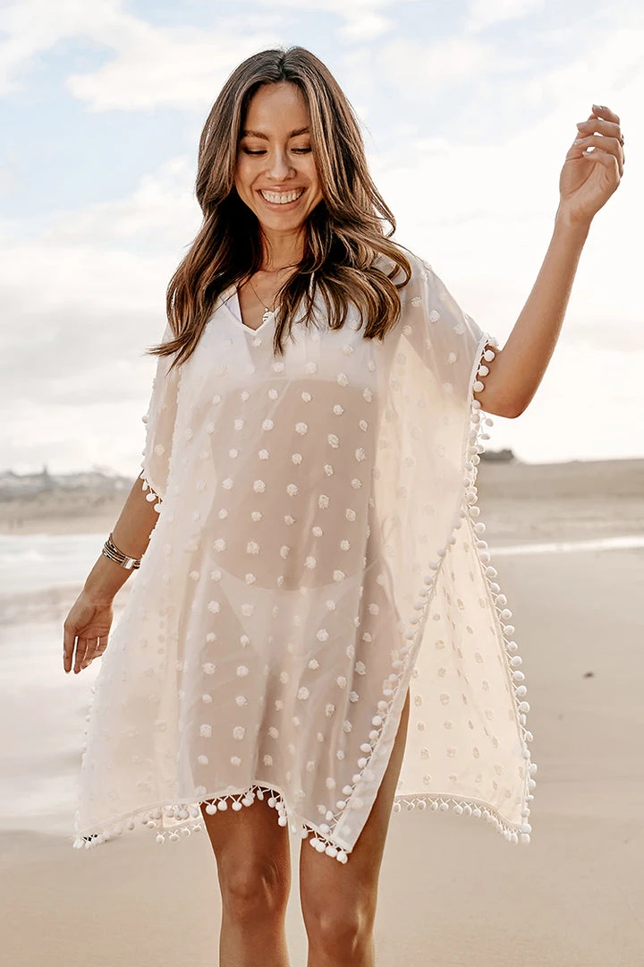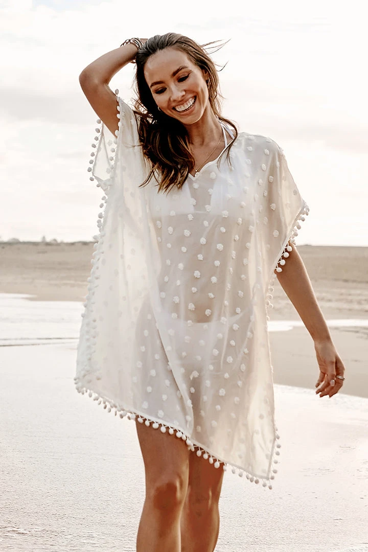 Get a light and airy fit in this Flared Sleeve Lace Trims Cover-up Dress. Features lace trims and fringe detailing. The perfect cover up to wear with your favorite bathing suits.