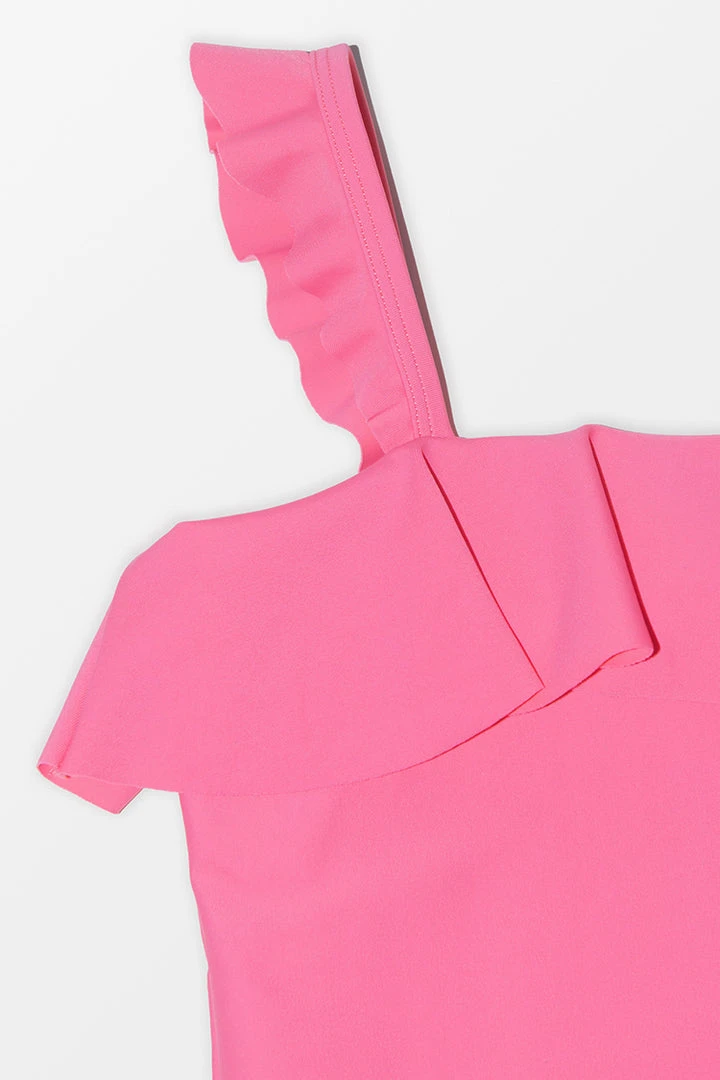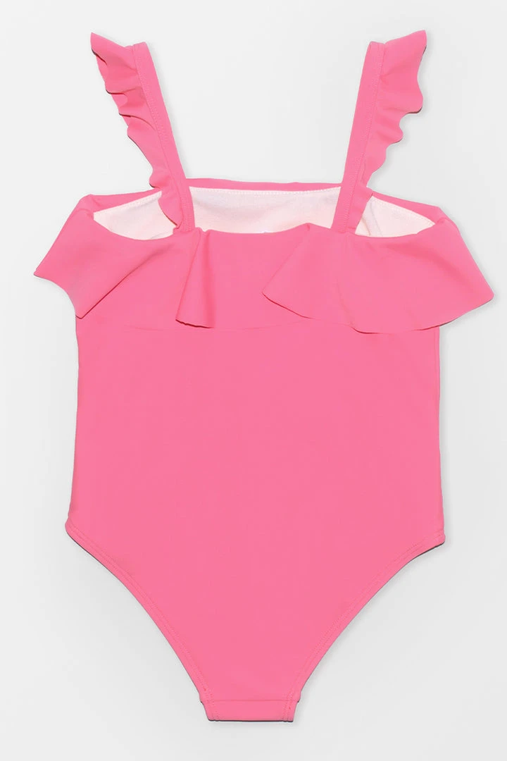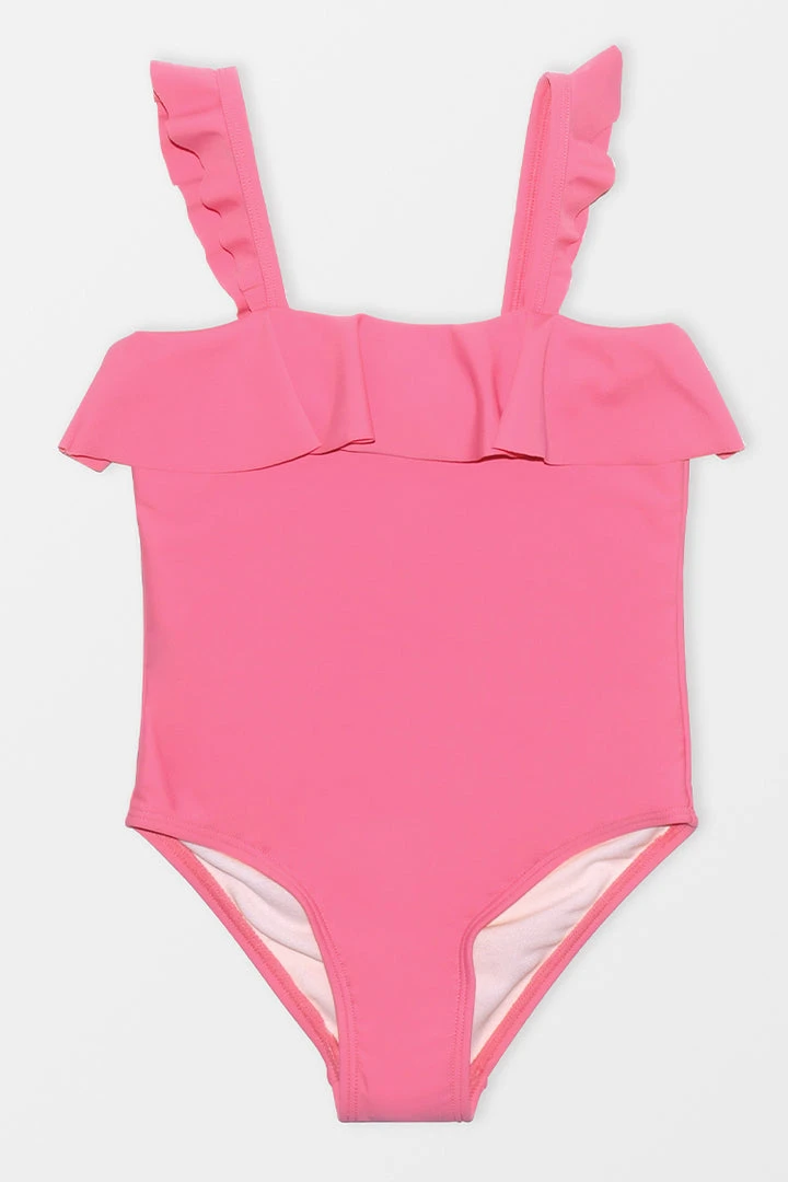 A lovely and simple one piece accented with romantic ruffles at the neckline and shoulder straps.