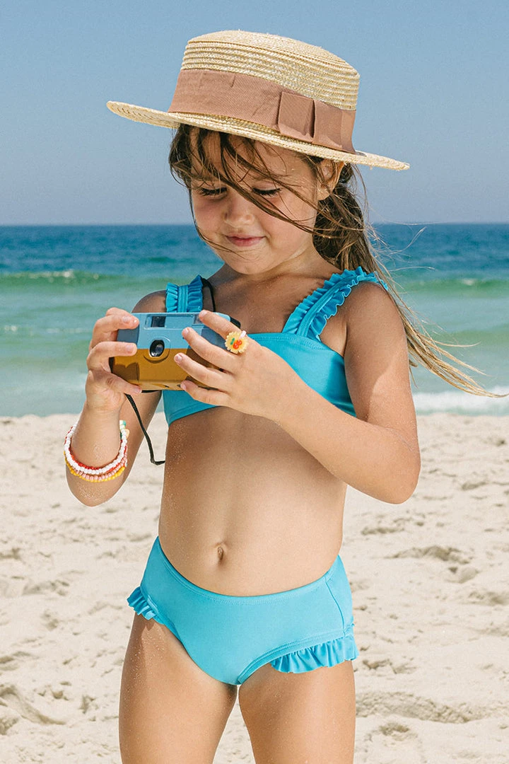 The ruffled straps and square neckline add a modern, playful look while the sky blue color gives it a soft, elegant touch.