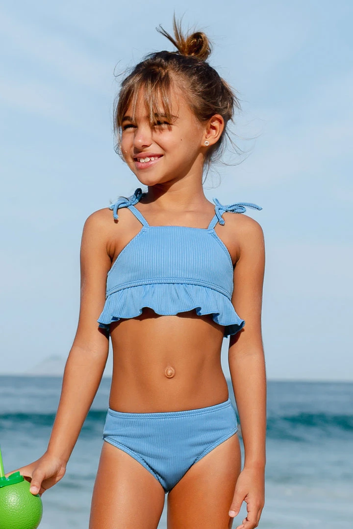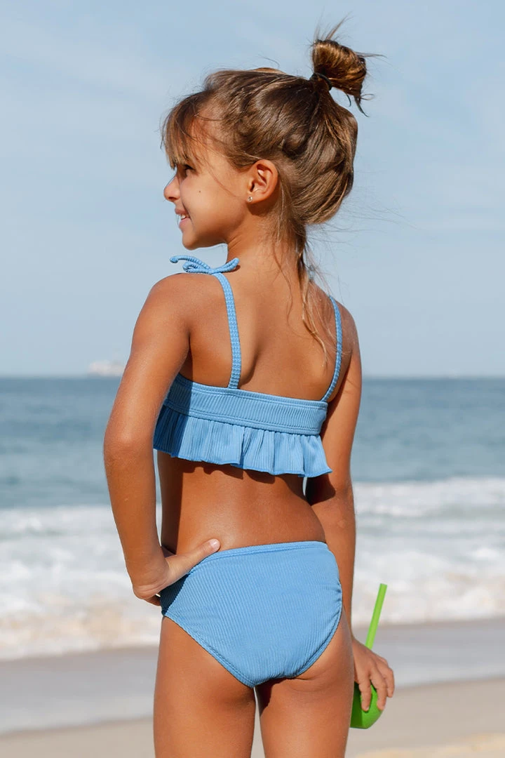 Chase the sun with this midkini/hipster bikini set. The shoulder ties and ruffled hem add sweetness and movement to her look. The matching hipster bottom has standard bum coverage.