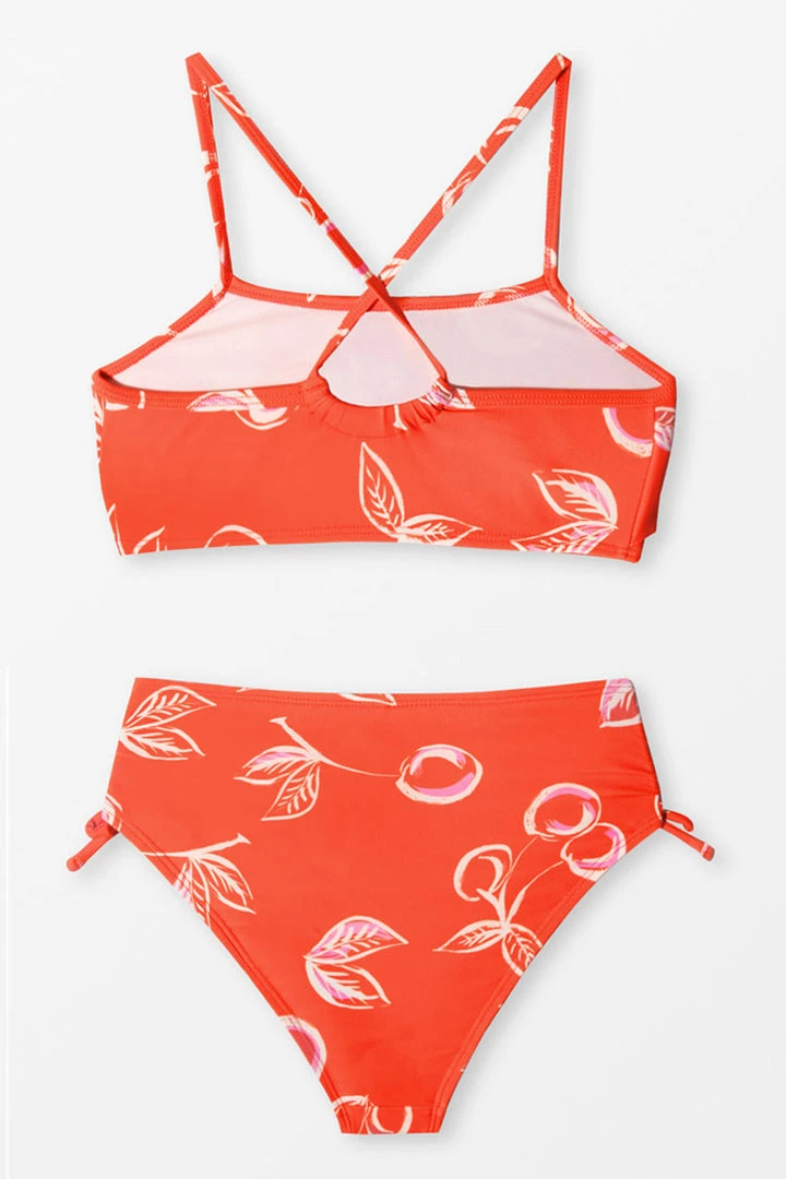 Your little one will love to show off her cute style in the Sweet Cherries Flounce Midkini and Tie Side Hipster Set. Adorned with a sweet cherry pattern, the midkini top has straps that crisscross at the back with a keyhole accent for a playful look and flounce bodice to add movement to her look. The matching bottom features drawstrings at both sides with shirring for extra flair and definition.