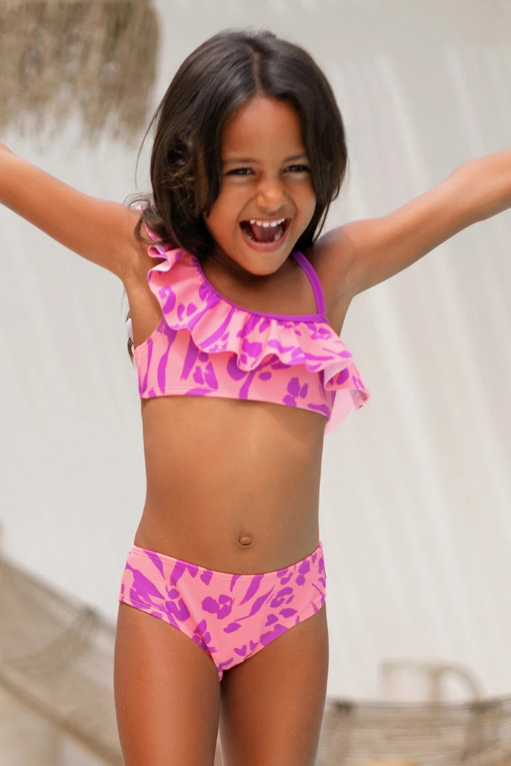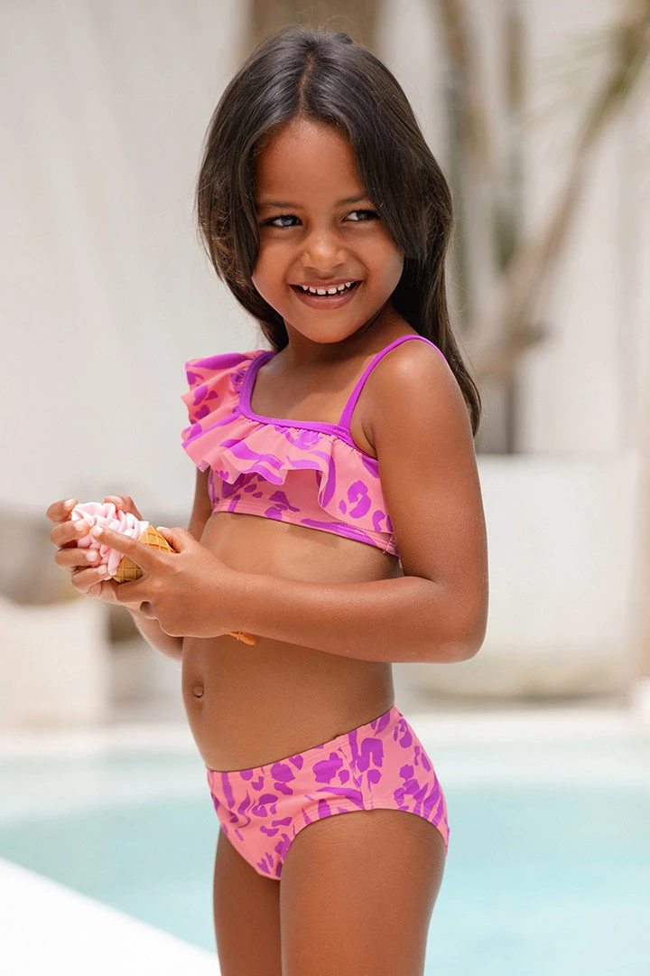 A mix and match of sweetness and wild funk with cute ruffles and a bold leopard print. Your little girl is ready to splash and play in style.