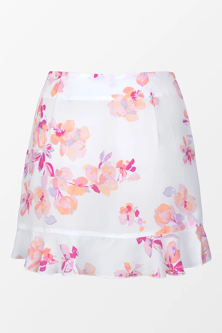 Add Gisselle Floral Tie Front Beach Skirt to your vacay wardrobe. Featuring floral print with ruffle hem and tie front design.