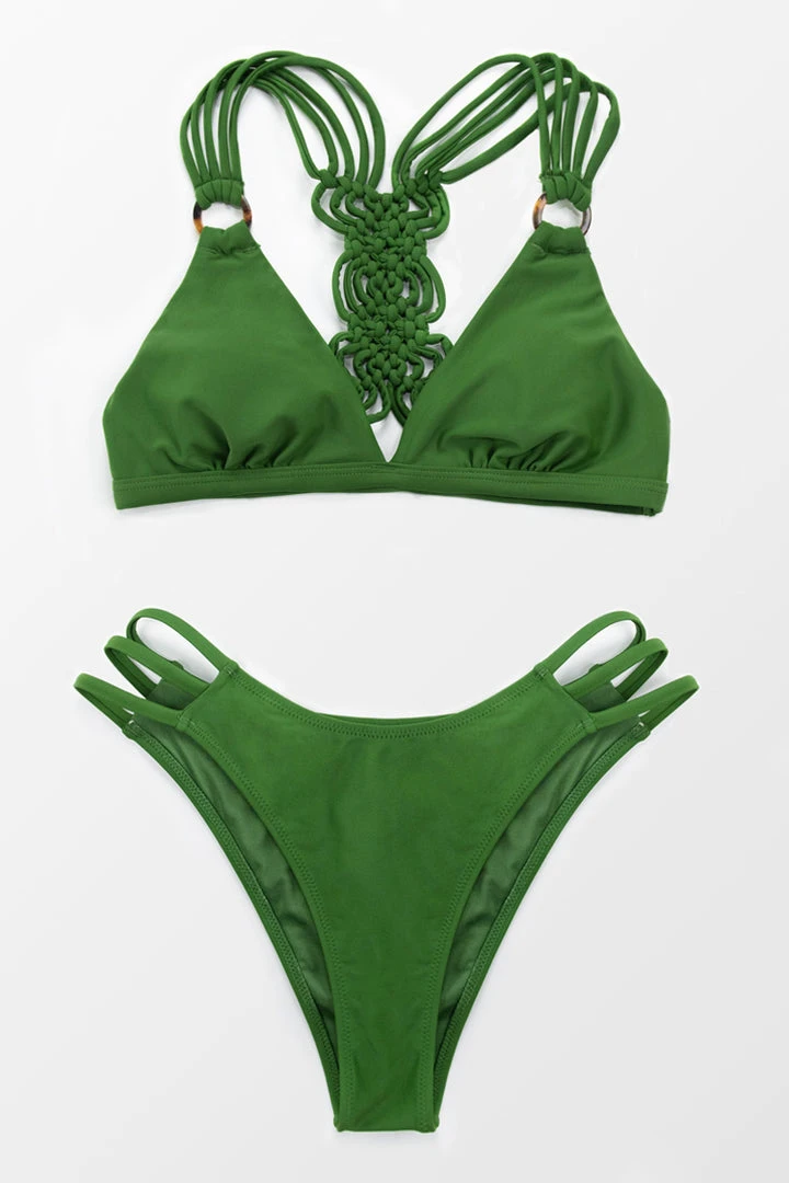 Our Green Braided Back Bikini set is fun and bold! This stunning set features a strappy top with braided detailing. Matching bottoms has strappy sides with a low rise fit and cheeky coverage.