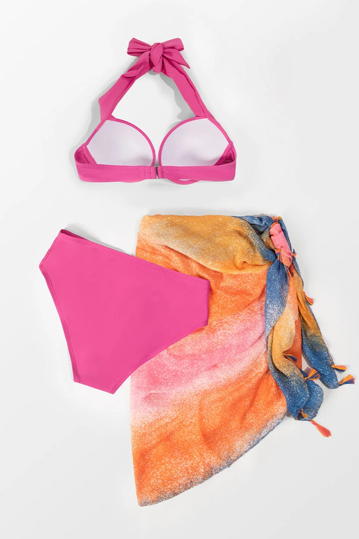 Just in time for the hot weather, here’s a colorful swimsuit sarong set that will take your beach look to a new level. The bikini set shows off your enviable future with molded push-up cups that enhance the bust and shape your curves. The sarong has a beautiful ombre print in shades of pink, orange, and blue.