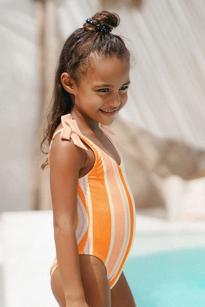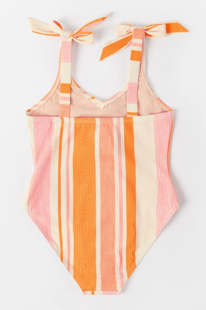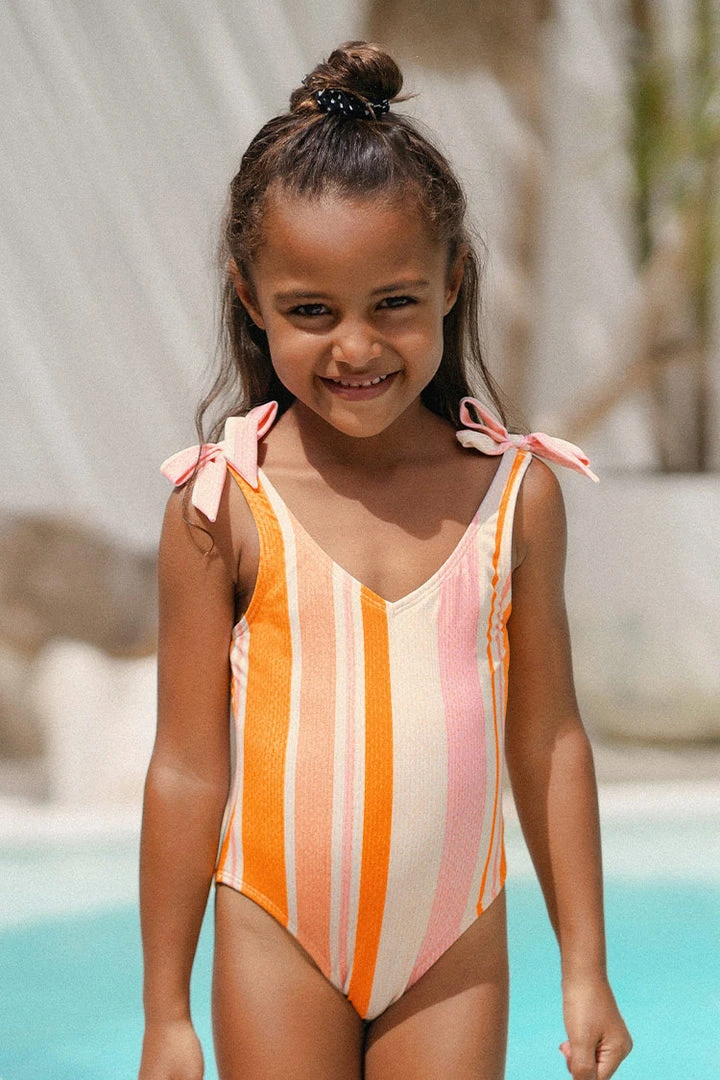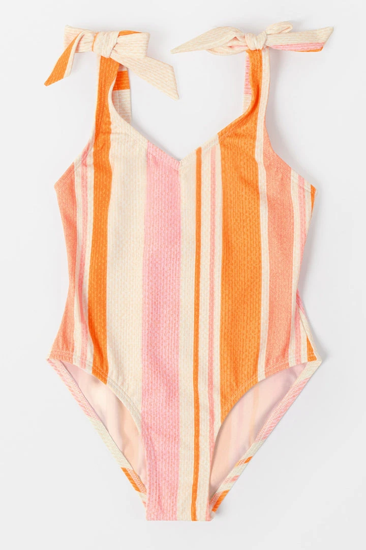 The Happy Stripe Girls’ Fixed Shoulder Bow Tie One Piece Swimsuit features cute shoulder bow ties and vibrant striped print to take the classic silhouette to the next level.