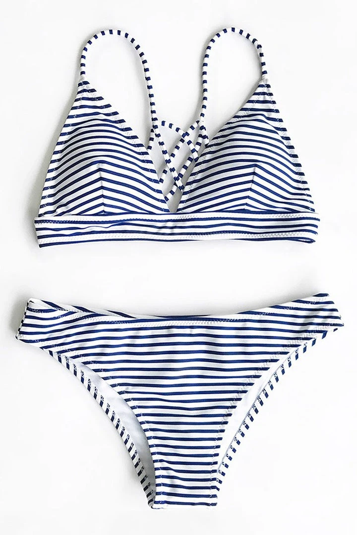 The Hit Summer Stripe Bikini top features strappy criss-cross back and shoulder straps. Includes matching bottom with just right amount of coverage.