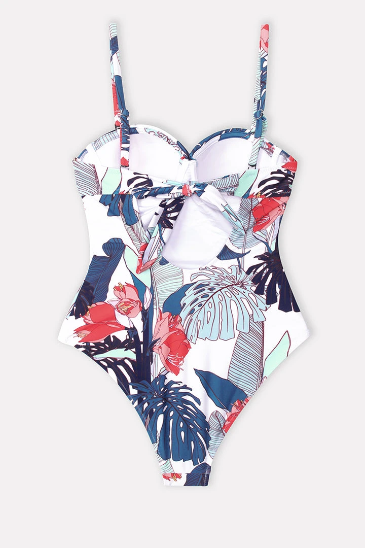 Show off your wild side in our Jewel Tropical Twist One Piece Swimsuit. Features tropical print and twist front detail. Back tie for a comfy fit. Perfect for laying out poolside to beach parties.