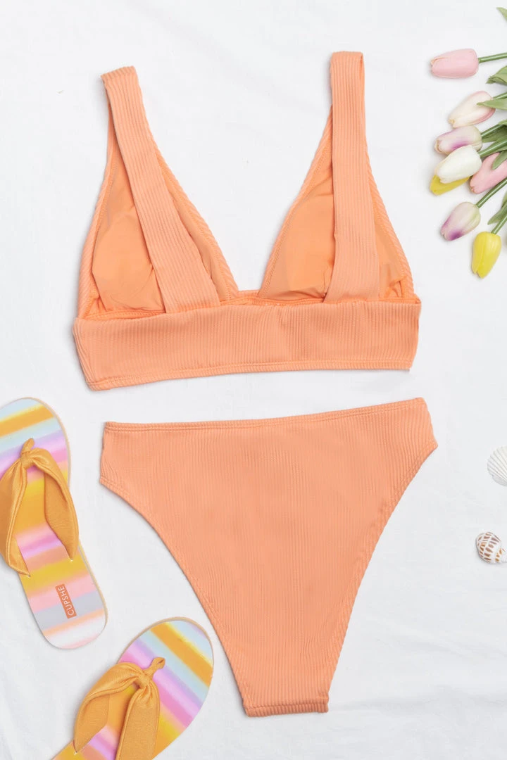 Slay the whole beach in our Katlyn Rib Wide Strap Bikini. Bikini top features tall triangle and plunge neckline. High waist bikini bottom for your comfort.