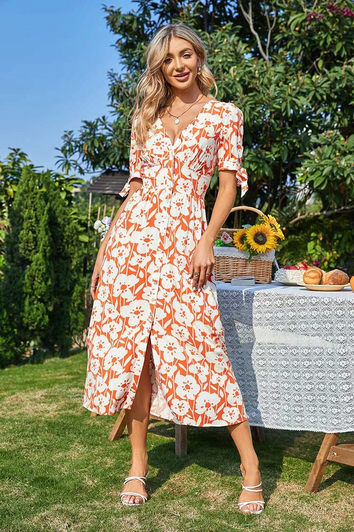 This Kayley V-neck Tie Fitted Waisted Bubble Sleeve A-Shape Dress with floral pattern highlights your temperament and giving people a fresh and natural feeling.