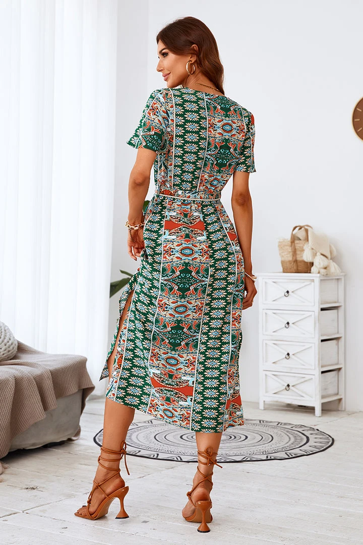 This V-neck Short Sleeve Lace Up Dress is on our hitlist. Features ethnic print pattern with v-neckline and short sleeve, wear this dress with strappy heels for a look we love.