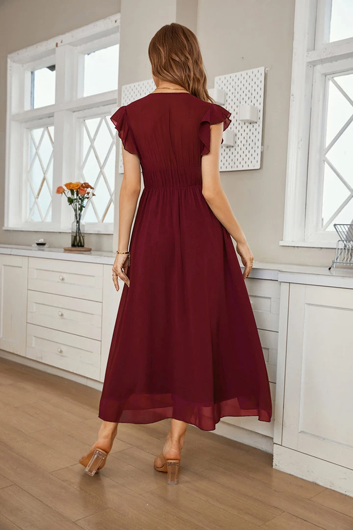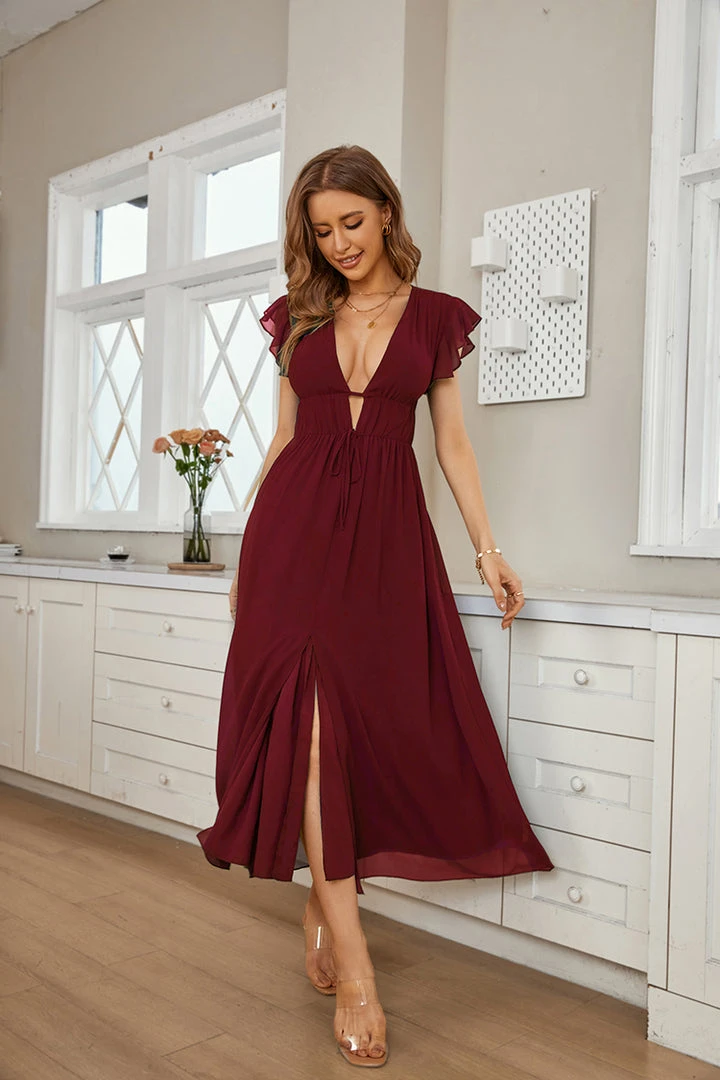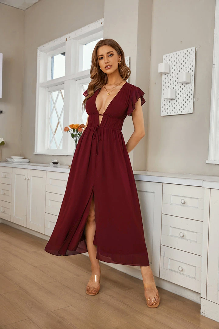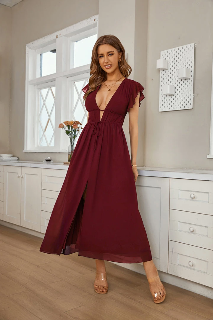 Get vacay-ready with this Plunge Tie Ruching A-Shape Dress. Featuring a plunging neckline, a-line skirt falls from the waist to a maxi hem. Elastic at the waist for fit.