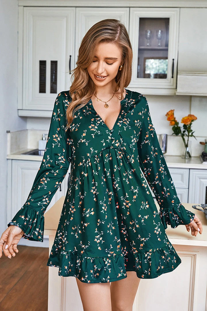 This Londyn V-neck Ditsy A-Shape Dress is very unique, and the ruffle design of the dress adds a bit of youthful vitality. On the whole, it is very in line with the aesthetics of young people.