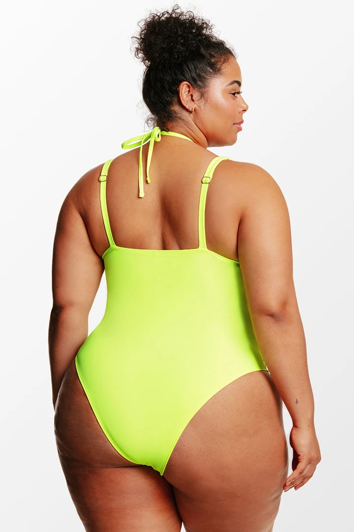 Be bright and bold in this one-piece swimsuit! This swimsuit offers a sexy edge with its plunging halter neckline, strappy design, and cheeky high-leg cut.