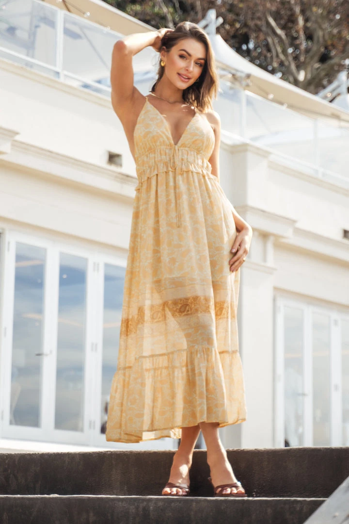 Don’t miss our Madalynn Frill Backless Plunge Slip Dress on vacation. Featuring ruching design and paisley pattern. Wear this dress with strappy heels for a look we love.