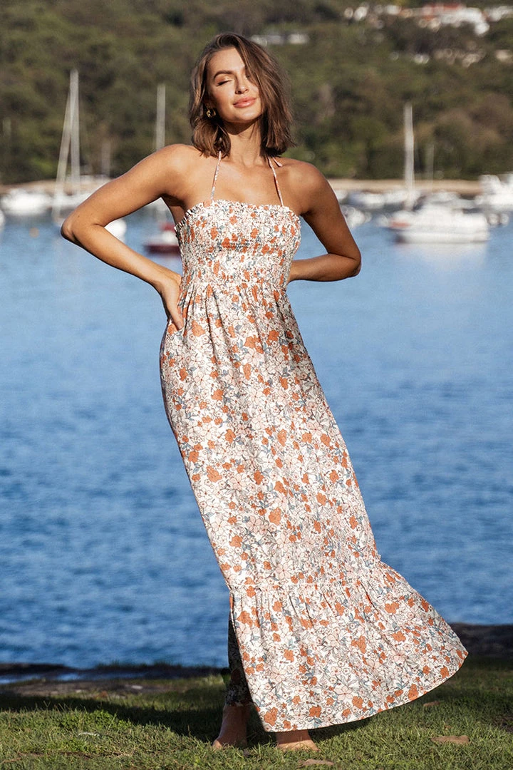 Relax in style in this Madalynn Strap Smocking Maxi Slip Dress. Detailed with ditsy floral and halter neck. This is a perfect dress to wear on your beach getaways.