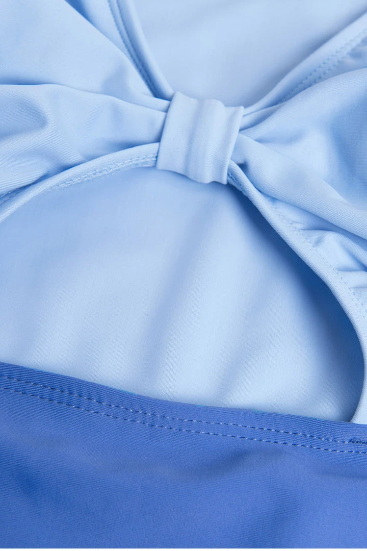 You know it’s going to be a good day when you get to slip into the Malayah V-neck Knot Long Sleeve One Piece Swimsuit. A knot in the middle of the v-neck and cutout. Feel like the ocean itself in this blue color block swimsuit.