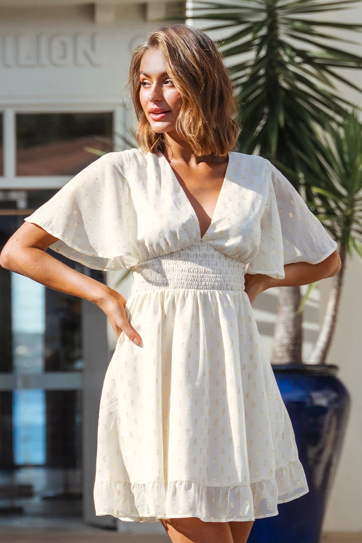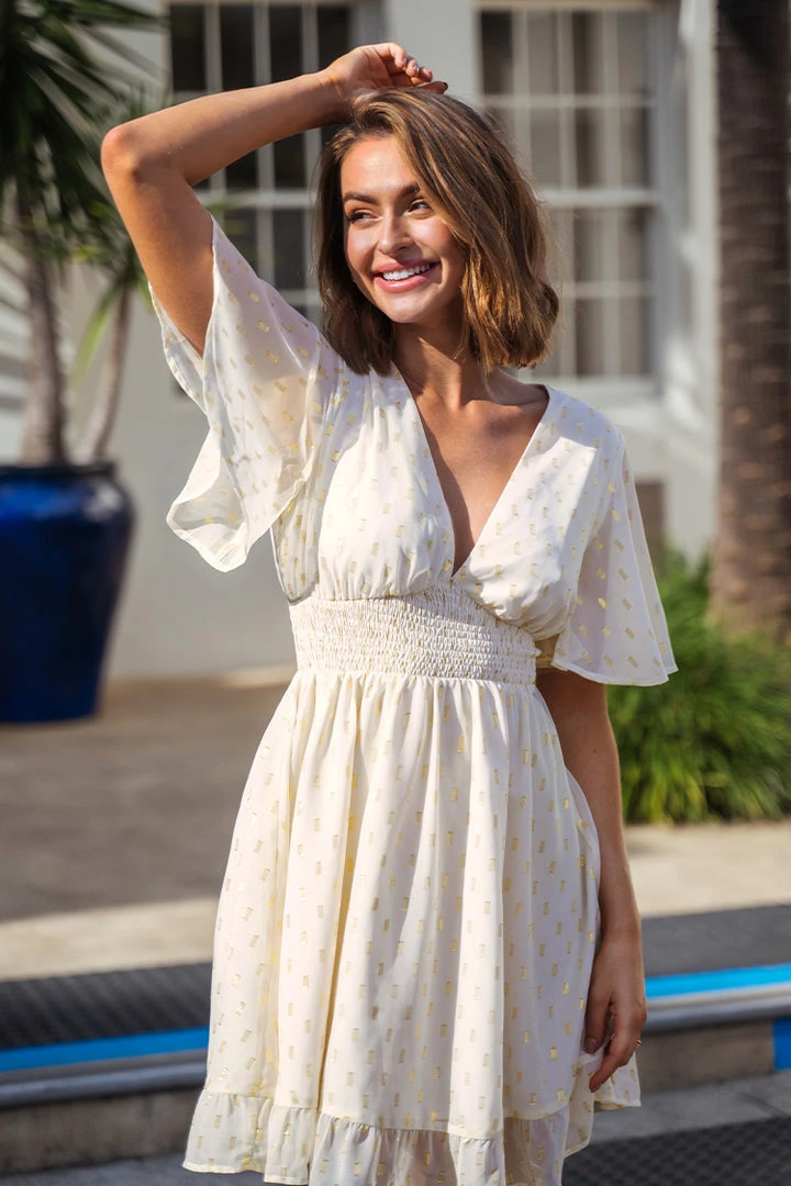 This Maritza V-neck Short Sleeve Elastic Waist Dress uses polka dot patterns to give people a feeling of summer. Wearing it, you will be as charming as summer.