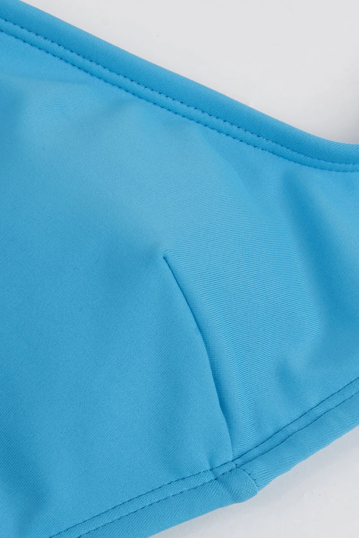 A stretchy knit in a sweet blue hue makes this mini bralette high waist bikini set perfect for your next poolside frolicking.