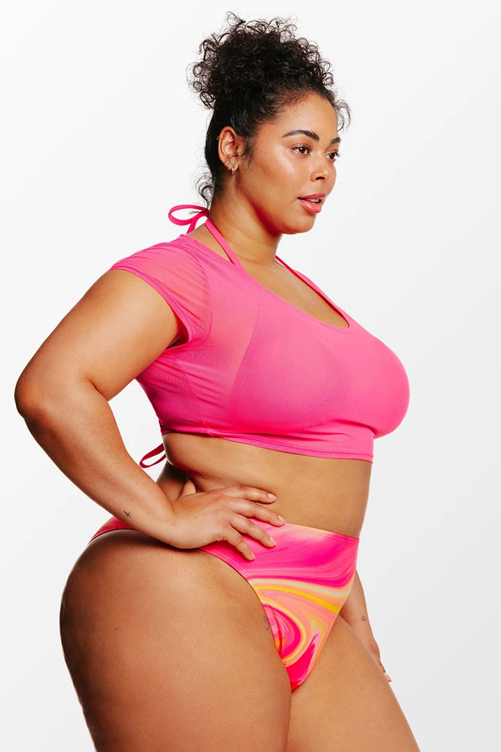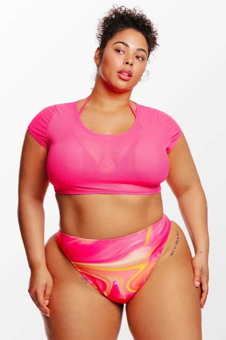 Be the envy of your friends at the next pool party with this bikini set featuring a triangle top with a plunging halter neckline and back self-tie closures, a pair of bottoms with an allover swirlfriend print, high-rise waist, and an ultra cheeky high-leg cut. The look’s finished with a matching sheer mesh crop top!