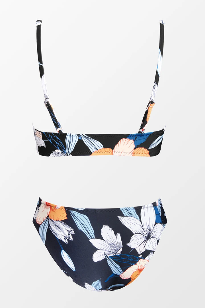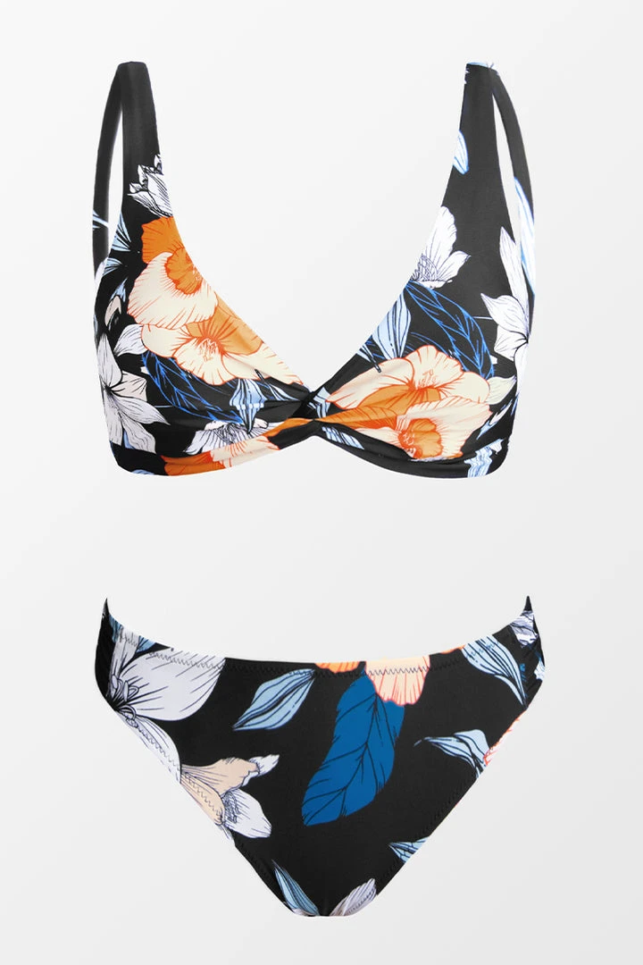 Glisten in the sun with the Midnight Flowers Twist Front Bralette and Hipster Bikini Set. The floral pattern brings sophistication to the ensemble while twist front design and side tabs add definition and style to the set.