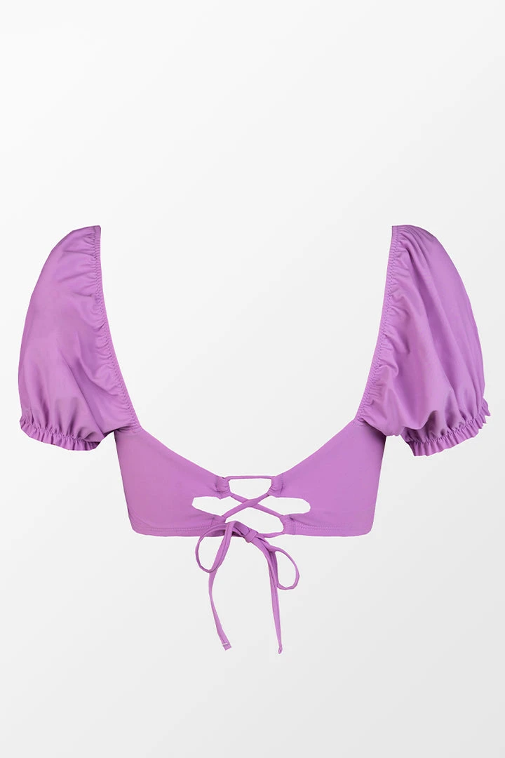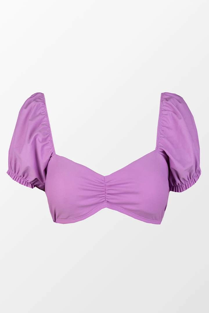 Look super cute and super flirty in our Mindful Solids Amethyst Puff Sleeve Bikini Top! Features a puffed sleeve bandeau with removable soft cups. Pair with the Mindful Solids Amethyst Adjustable High Waist Bikini Bottom.