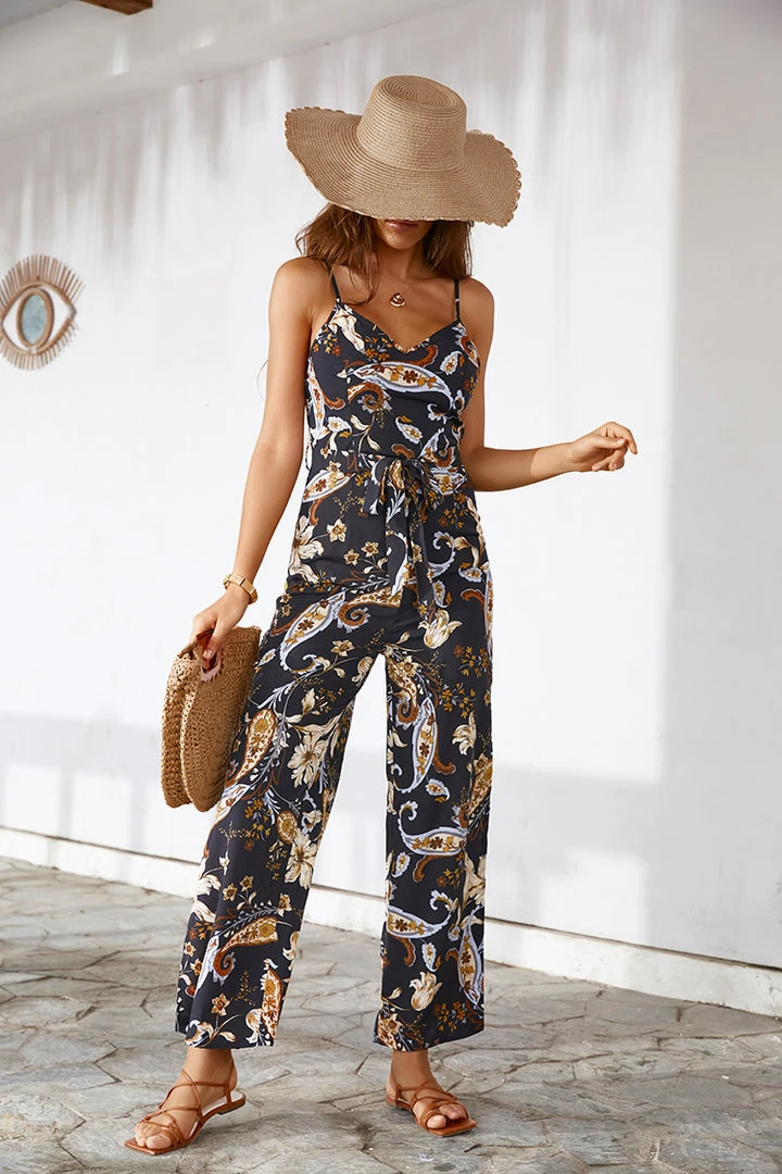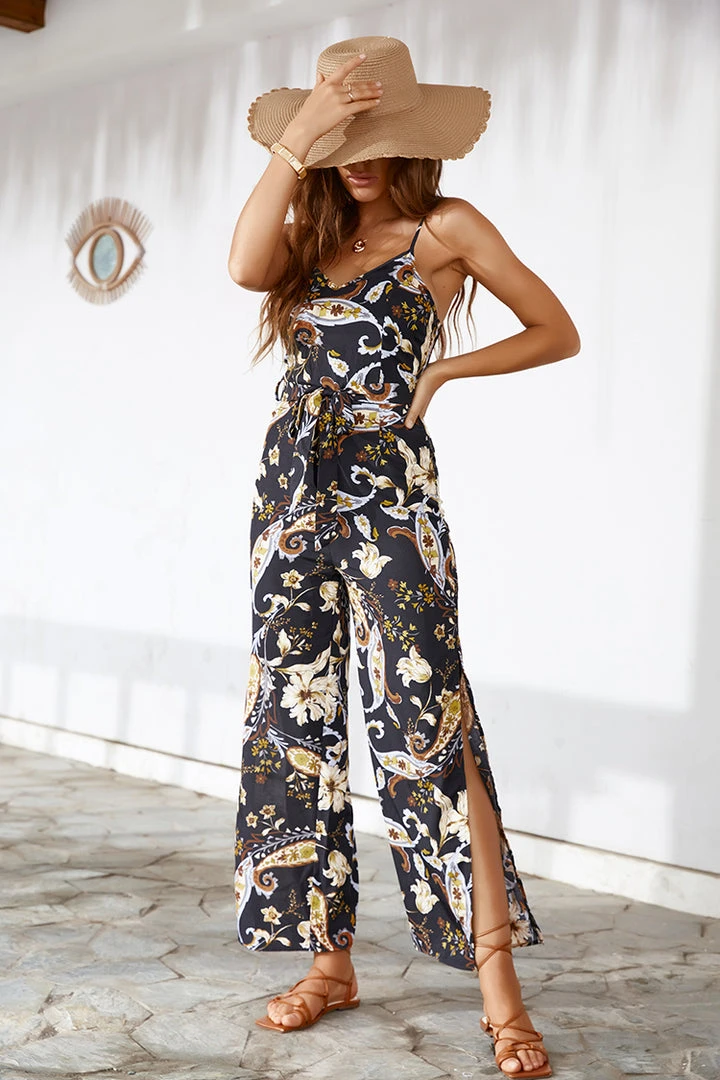 Turn up the temperature on your tropical escape with the Tie Waist Thin Straps Floral Jumpsuit! Tie waist and breezy wide-leg pants. This jumpsuit is timeless to create a breezy summery look.