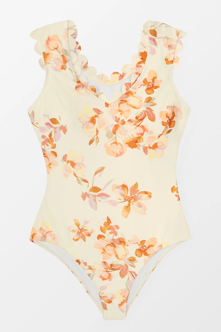 Add a touch of style in our Adeline V-neck Floral Scalloped One Piece Swimsuit. Features with wide straps and v-neckline decorated with scalloped on the edge. All floral print over this swimsuit add a touch of cute.